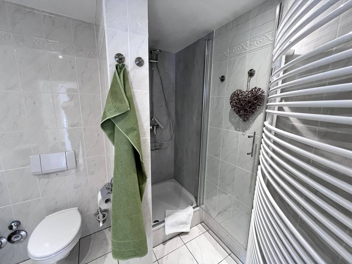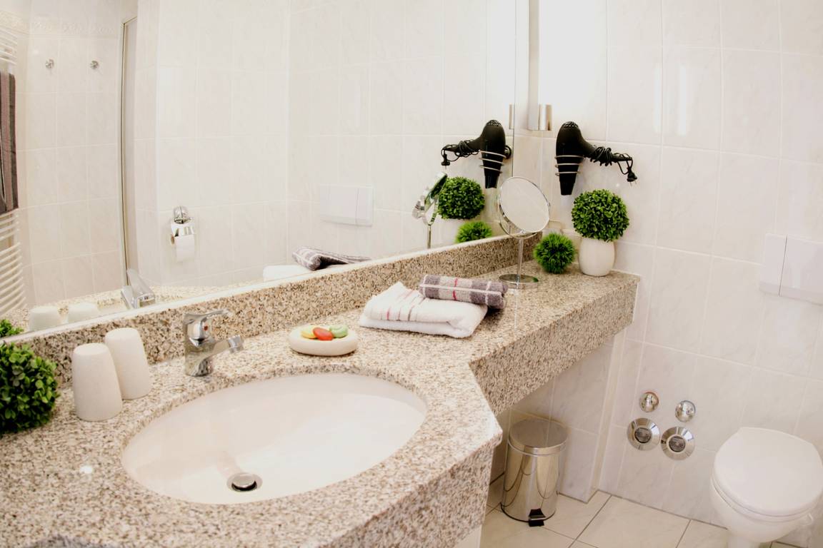 Das Bad mit großem Granitwaschtisch mit sehr vielen Ablagemöglichkeiten, Fön, Vergrößerungsspiegel, Toilette, Dusche und Handtuchheizkörper.