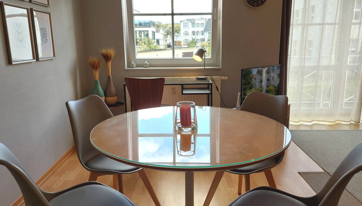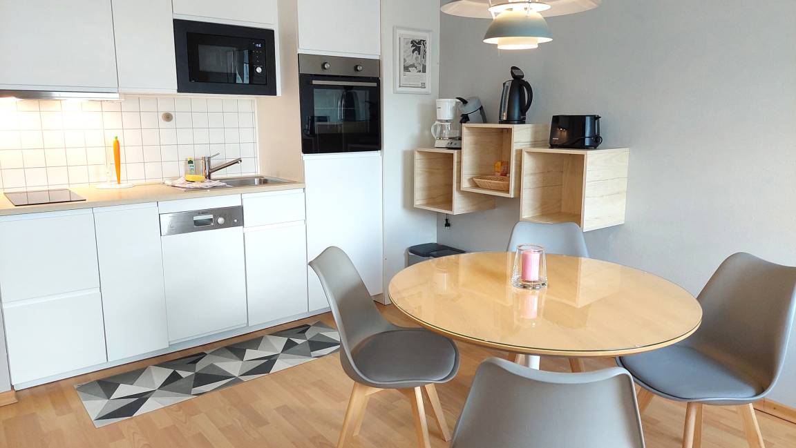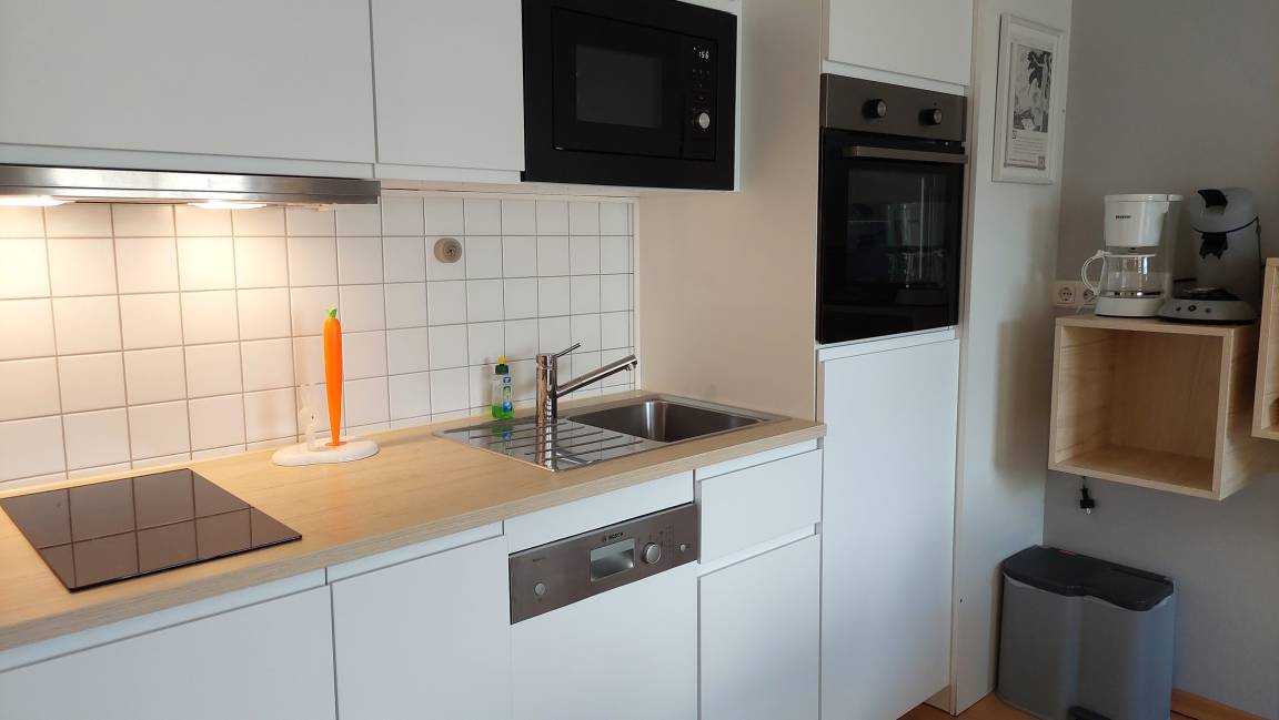 Es gibt einen Esstisch mit 4 Sitzgelegenheiten und eine moderne Kochzeile. Diese beinhaltet unter anderem einen Backofen, ein 2-Platten-Cerankochfeld, einen Geschirrspüler und eine Mikrowelle.