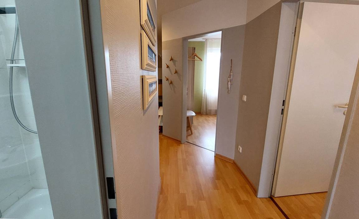 Vom Eingangsbereich, samt großem Spiegel und Garderobe, gelangen Sie in beide Schlafzimmer und Vollbäder, sowie in den nützlichen Abstellraum und in den großen Wohnbereich.