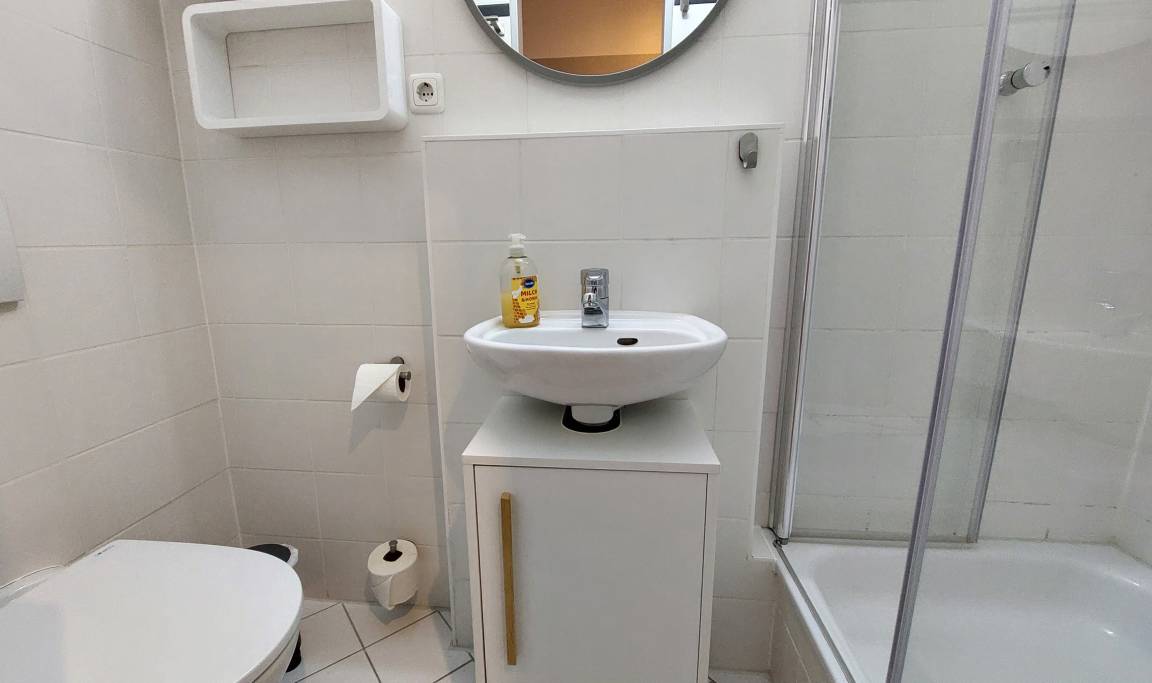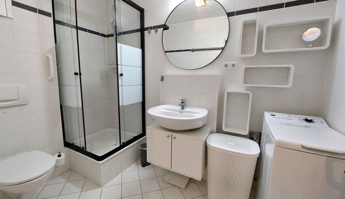 Beide Bäder beinhalten Dusche, WC und Waschtische. Im größeren Bad befindet sich zusätzlich eine Waschmaschine.
