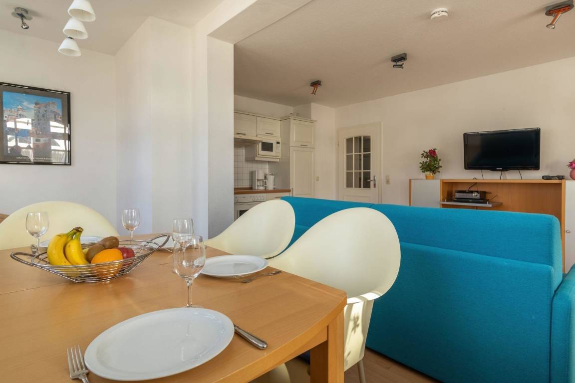 Unser 2- Raum Apartment bietet auf 50 qm Platz für bis zu 4 Personen. Im Wohn/Essbereich ist eine umfangreich ausgestattete Küchenzeile integriert.