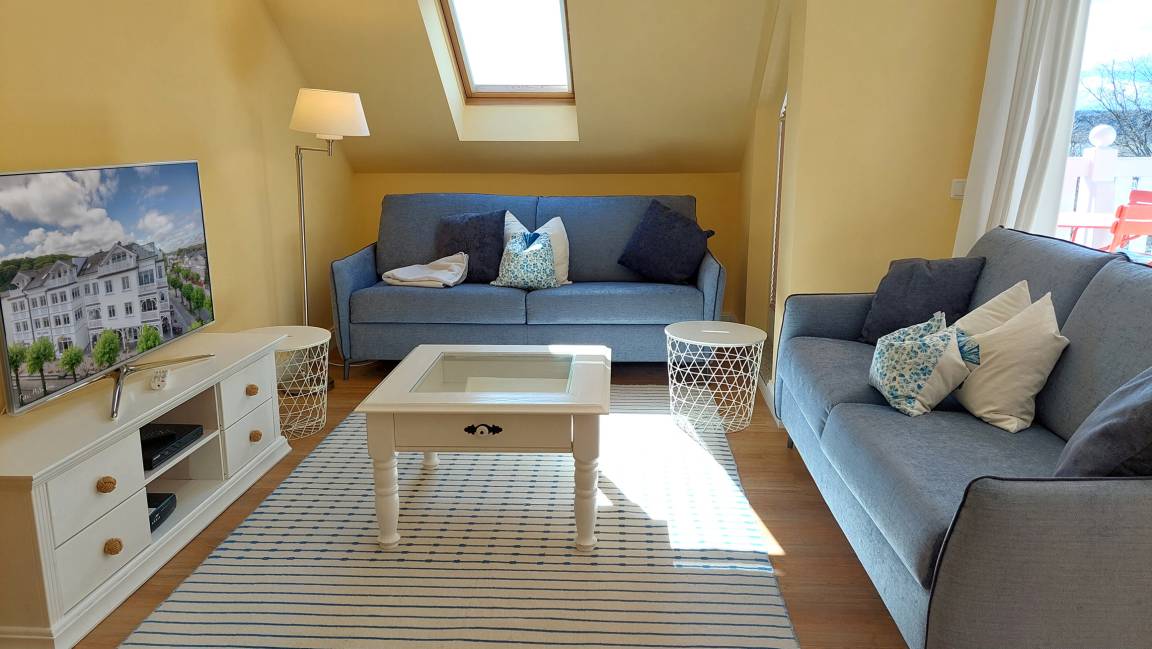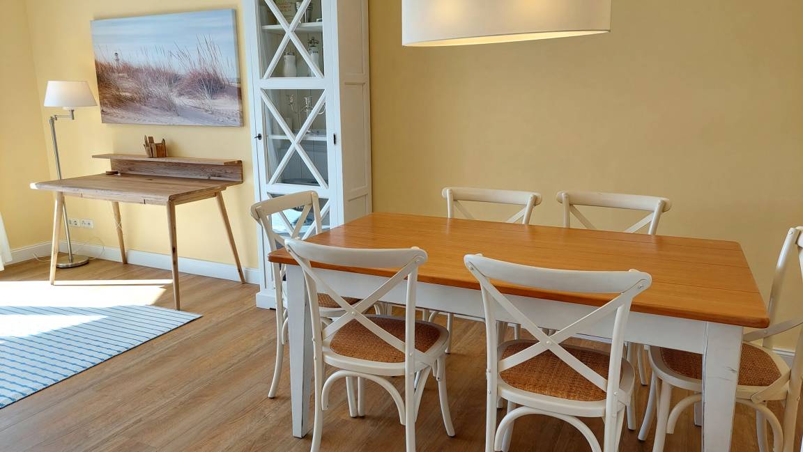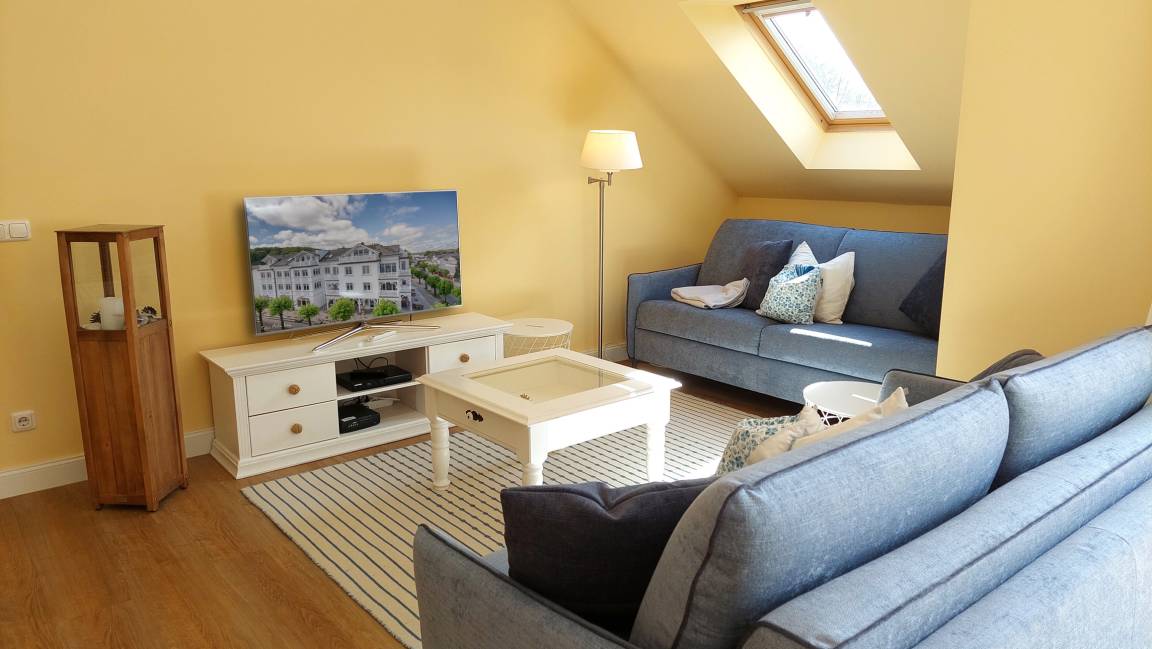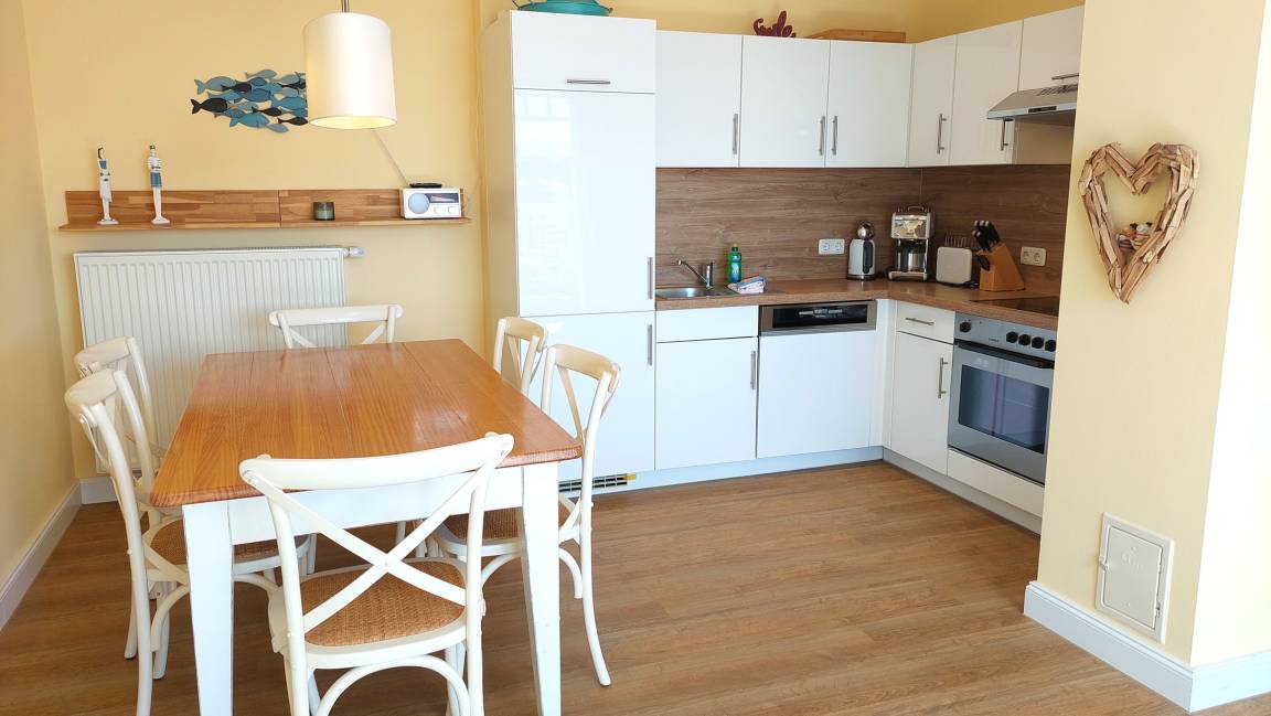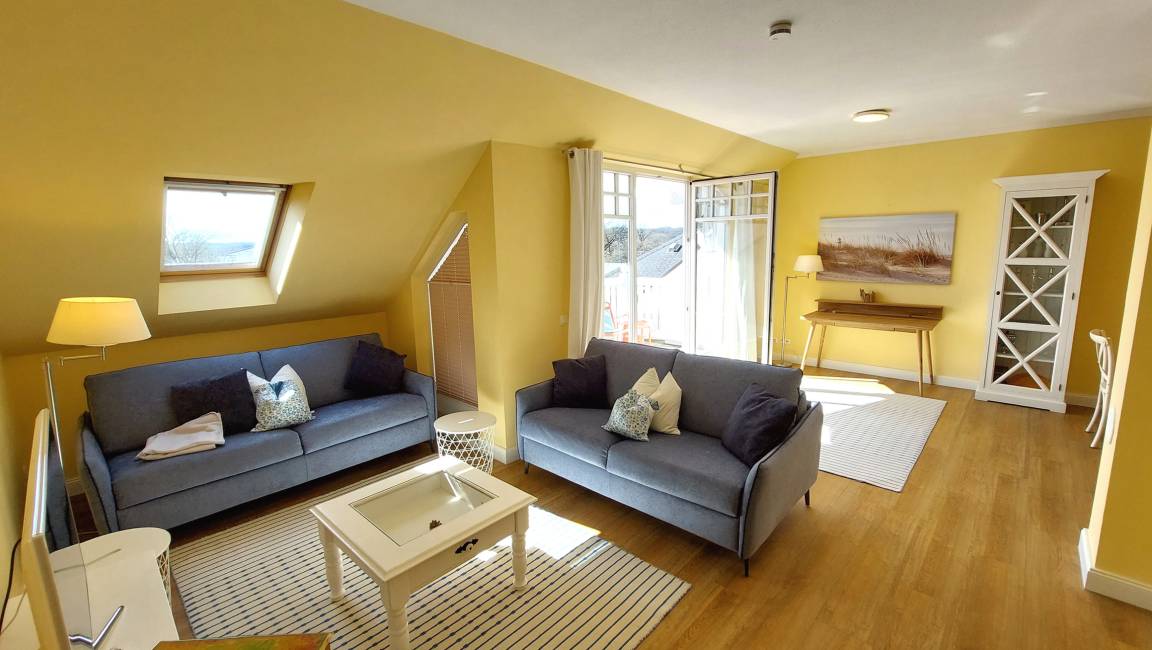 Im Wohnraum können auf dem großen Schlafsofa zwei weitere Personen schlafen. Die gesamte Wohnung ist mit hochwertigen Möbeln aus weiß gebürsteter Pinie im Villagestil eingerichtet. Im Wohnraum befindet sich ein Smart-TV und Radio/CD-Spieler, Sitz- und Essplatz sowie die halboffene Küche mit Geschirrspülmaschine, Backofen, Herd, Kühlschrank und diversen Kleingeräten.