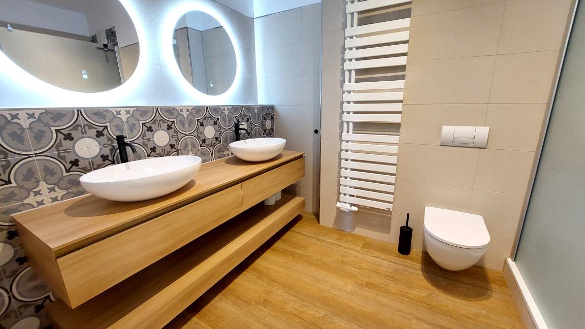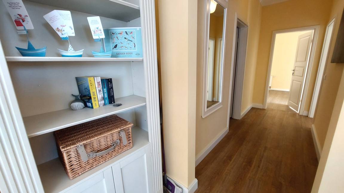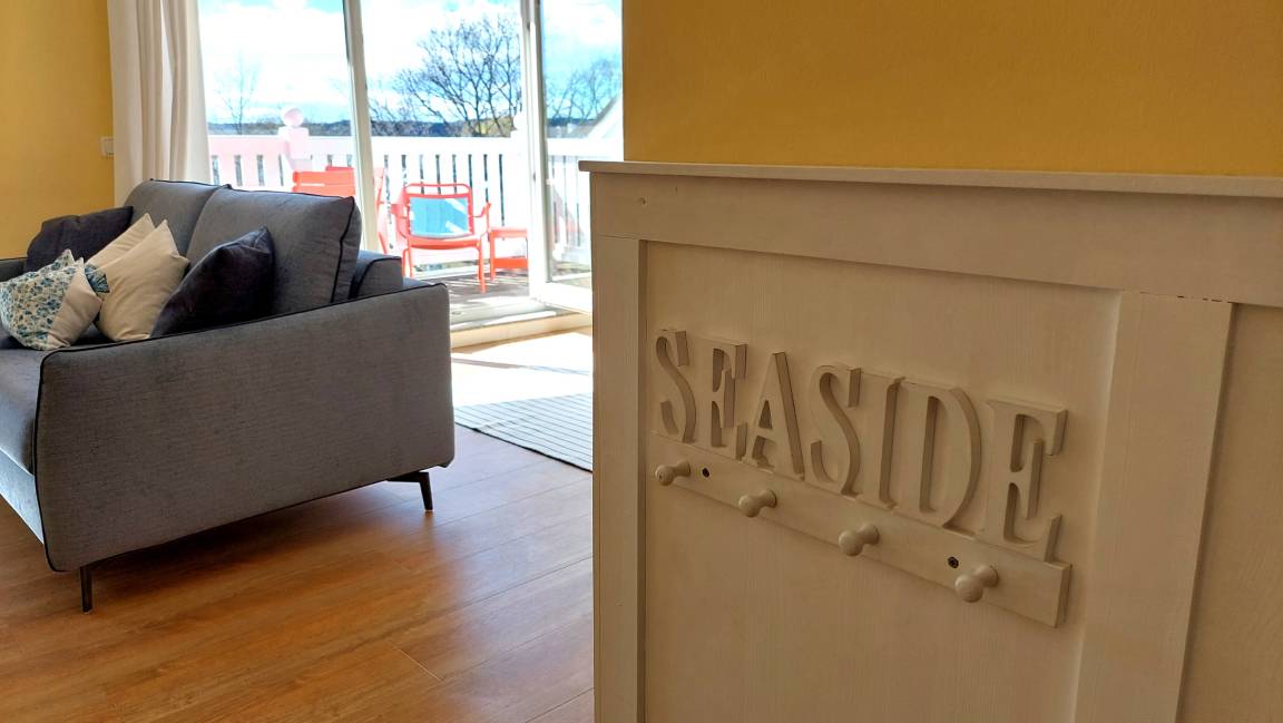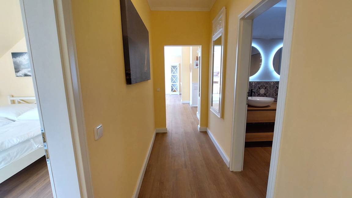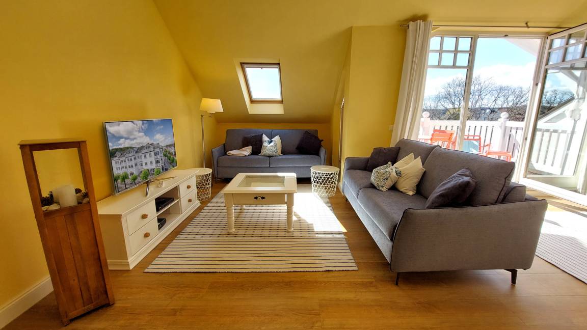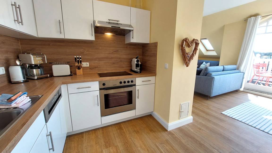 Im Wohnraum können auf dem großen Schlafsofa zwei weitere Personen schlafen. Die gesamte Wohnung ist mit hochwertigen Möbeln aus weiß gebürsteter Pinie im Villagestil eingerichtet. Im Wohnraum befindet sich ein Smart-TV und Radio/CD-Spieler, Sitz- und Essplatz sowie die halboffene Küche mit Geschirrspülmaschine, Backofen, Herd, Kühlschrank und diversen Kleingeräten.