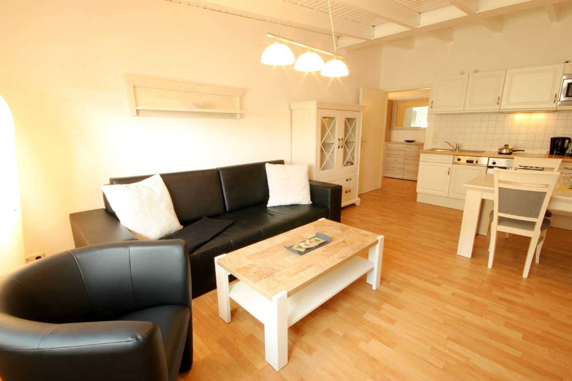 Ihre attraktive und großzügige 2-Zimmerwohnung 23RB38 mit wohnungseigenen Strandkorb (Mai-Sept. 2026) hat eine Größe von ca. 50 qm und ist für 4 Personen eingerichtet. Die Nichtraucherwohnung befindet sich im 3. Obergeschoss des Hauses. Dem hellen Wohnraum schließt sich die weiße Wohnküche und der Essbereich an. Im separaten und geräumigen Schlafraum finden Sie ein modernes Doppelbett, einen Kleiderschrank sowie einen großen Flachbild-TV. Vom vorgelagerten Flur aus erreichen Sie das Badezimmer mit Waschtisch, Dusche, Wanne, WC und Fön. Im Wohnraum gibt es eine gemütliche Sitzecke mit Schlaffunktion, WLAN sowie einen weiteren Flachbildfernseher. Die Küche verfügt über einen Backofen, eine Mikrowelle, Kühlschrank, Geschirrspüler, Kaffeemaschine, Toaster und Wasserkocher. Haustiere sind herzlich willkommen! Ein PKW-Stellplatz steht Ihnen auf dem Parkplatz "Zentrum" (ca. 8 Gehminuten) zur Verfügung.