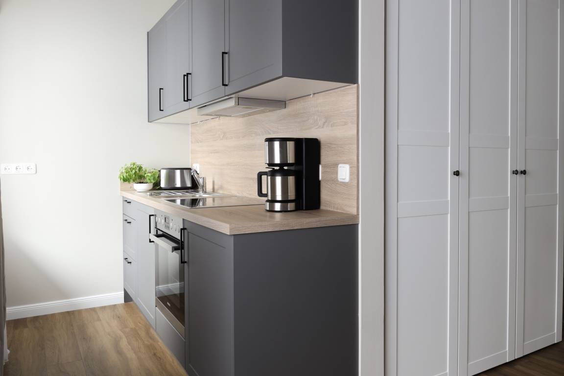 Die Küchenzeile ist ausgestattet mit einem Kühlschrank, Toaster und Ceran-Herdplatte, diese verfügt aber auch über Geschirr, Kochutensilien und Besteck.