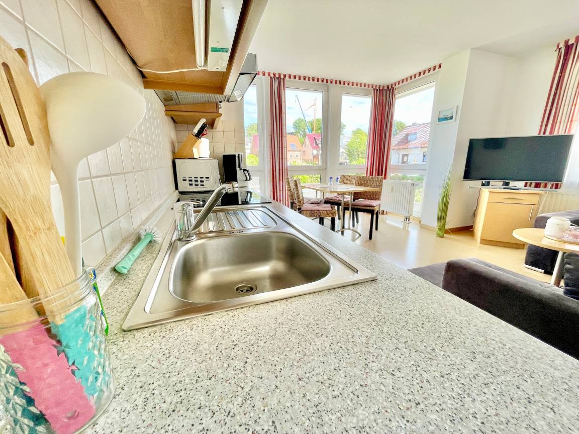 Küche: Die voll ausgestattete Küchenzeile verfügt über einen Herd, Kühlschrank, Mikrowelle, Kaffeemaschine, Wasserkocher und ausreichend Geschirr.