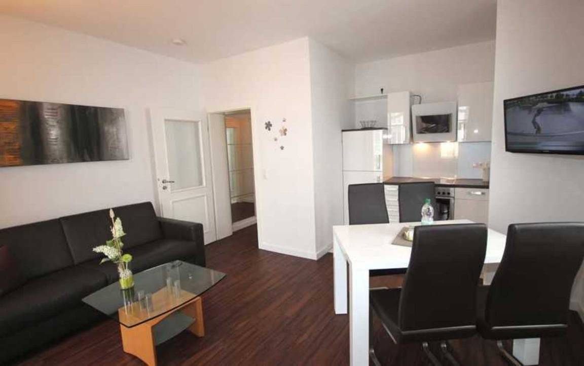 Ihre Ferienwohnung 1RB8 liegt im 1. Obergeschoß der Villa und verfügt über einen großen, überdachten Balkon. Die geräumige 2-Raum-Appartement bietet bis 4 Personen Platz für einen angenehmen Aufenthalt. Die Wohnung verfügt über einen Wohnraum mit halboffener Küche und integriertem Essplatz. Die gemütliche Couch kann zur Doppelbettcouch umgebaut werden, TV und Radio finden Sie ebenfalls im Wohnbereich. Weiterhin gibt es im Appartement ein großes Schlafzimmer mit Doppelbett, Kleiderschrank sowie ein Badezimmer mit Waschtisch, Dusche und WC. Alle unsere Gäste können einen kostenfreien W-LAN-Zugang nutzen. Einen appartementeigenen Parkplatz finden Sie direkt am Haus. Ein Münz-Waschtrockner steht Ihnen im Keller des Nachbarhauses zur Verfügung. Den abschließbaren Fahrradabstellraum des Nachbarhauses können Sie ebenfalls nutzen.
