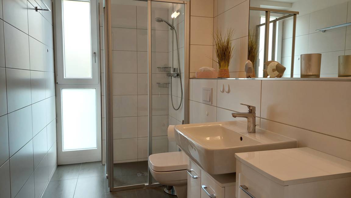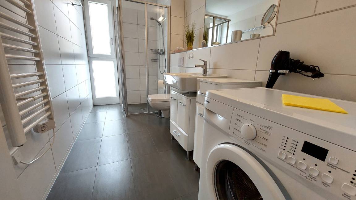Das Tageslichtbad verfügt über eine ebenerdige Dusche, WC, Waschtisch, Fön, Kosmetikspiegel und sogar über eine eigene Waschmaschine.