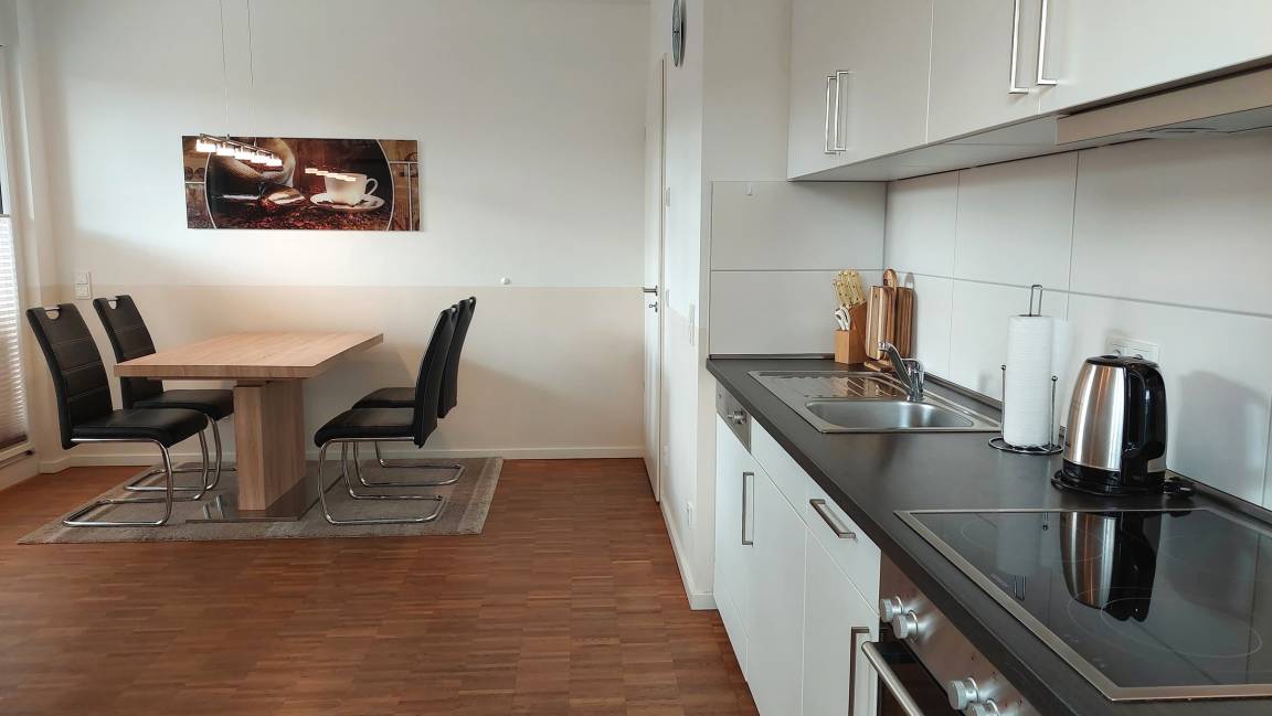 Im geräumigen und hellen Wohn- und Essbereich befindet sich ein moderne Kochzeile mit Ceranfeld, Backofen, Geschirrspüler, Mikrowelle und vielen nützlichen Küchenhelfern. Neben einer normalen Filterkaffeemaschine gibt es sogar einen Kaffeevollautomat.