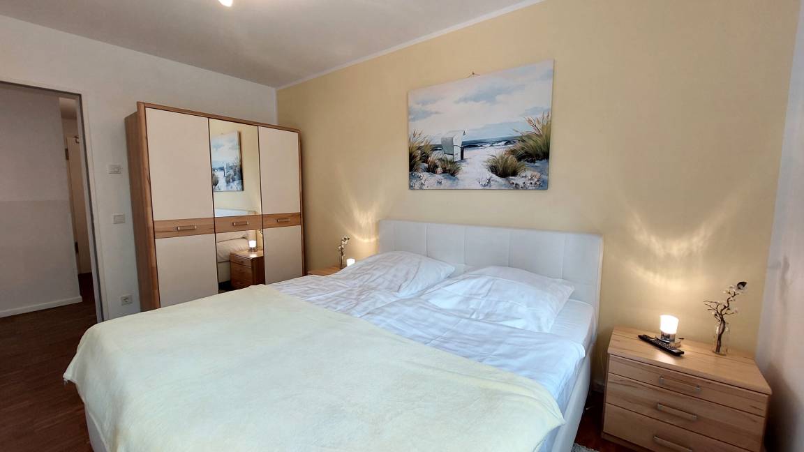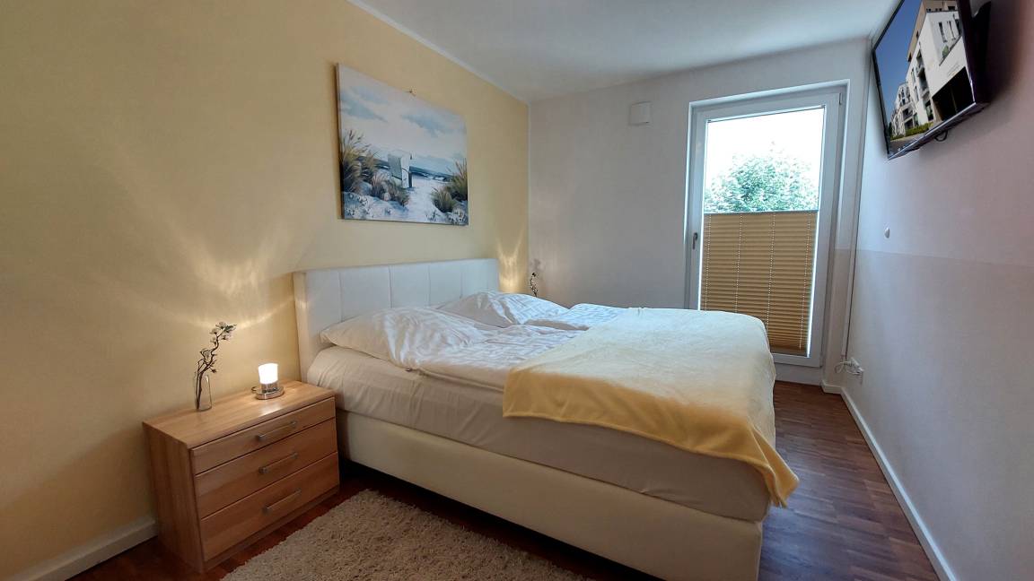 Vom Flur aus gelangen Sie ins Schlafzimmer, welches mit Doppelbett, Nachttischen, Kleiderschrank und TV ausgestattet ist. Darüber hinaus gibt es ein Terrassenzugang.