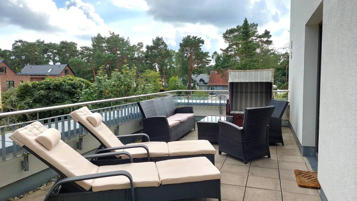 Das Highlight ist die große Sonnenterrasse, welche mit bequemen Outdoor-Möbeln (z.B. eigenem Strandkorb) zum Verweilen einlädt. Diese wäre auch via Treppe von Außen erreichbar,