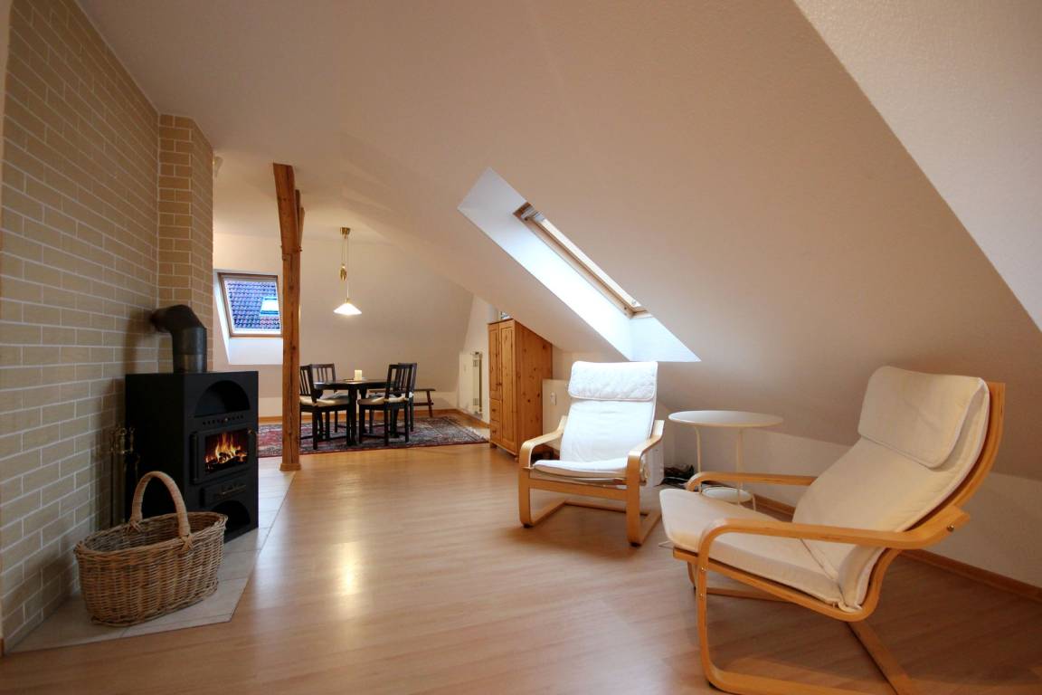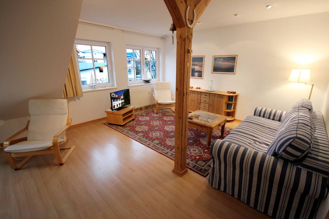 Ihr attraktives eingerichtete Studio 90375 befindet sich im Dachgeschoss des Hauses. Die offene Wohnung mit Südwest-Balkon hat eine Größe von ca. 60 qm und ist mit bis zu 4 Personen belegbar. Neben dem großzügigem Wohnraum mit Kaminofen, Essbereich, Laminatfußboden, integrierter Küchenzeile gibt es einen Schlafbereich sowie ein Duschbad mit Waschbecken, Dusche/WC, Handtuchtrockner und Fußbodenheizung. Im Wohnbereich können auf dem gemütlichen Schlafsofa zwei weitere Personen schlafen. An den etwas kühleren Tagen können Sie den Kaminofen für angenehme Stunden anheizen. Die technische Ausstattung umfasst einen LCD-TV sowie ein hochwertiges Bose-Audio-Set und WLAN. Der Schlafbereich ist mit einem großen Doppelbett sowie Kleiderschrank versehen. Die Küche verfügt über zwei Ceran-Kochfelder, Kühlschrank, Mikrowelle, Kaffeemaschine, Toaster und andere Küchenhelfer. Der nach Südwest gelegene Balkon lädt ganztägig zum Sonnenbaden und Relaxen ein.