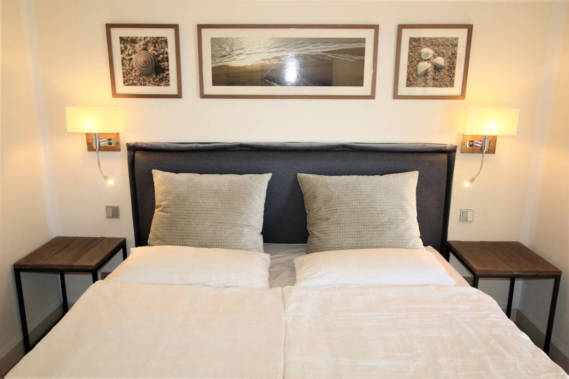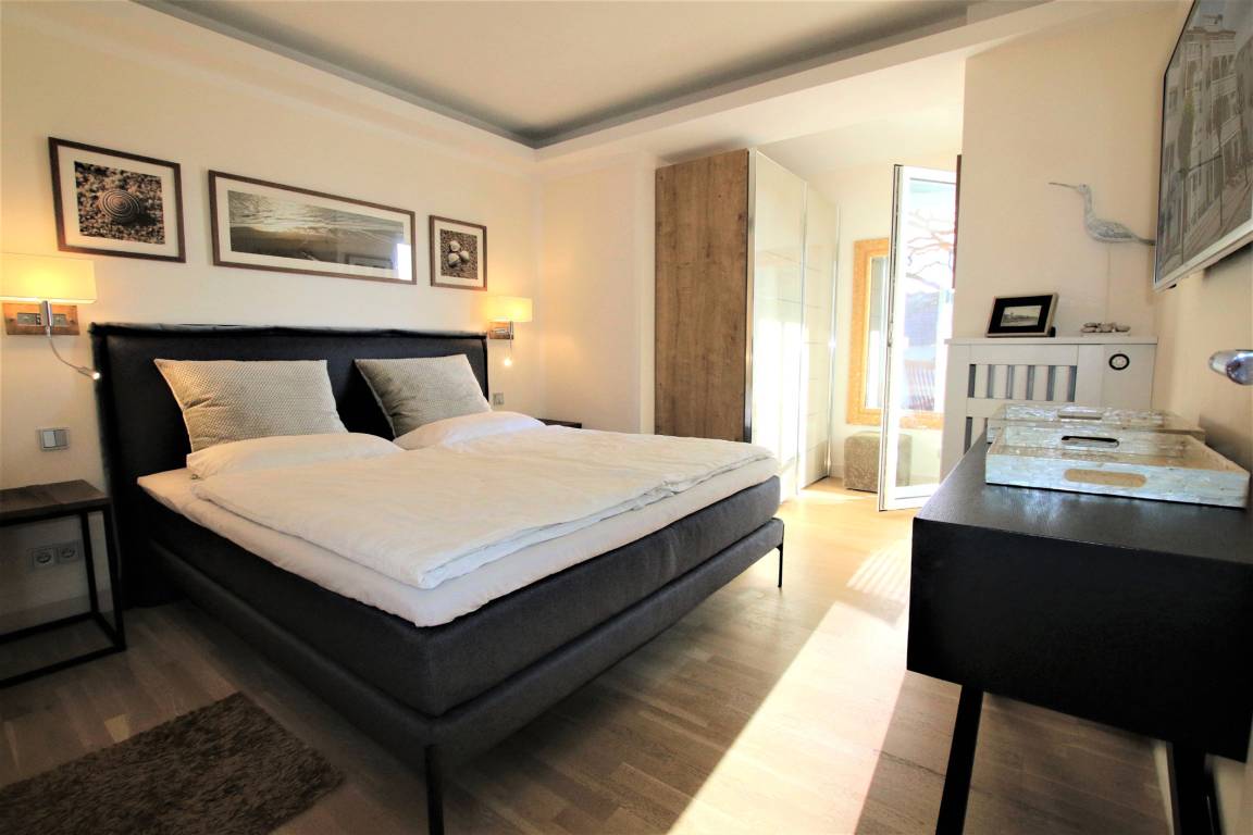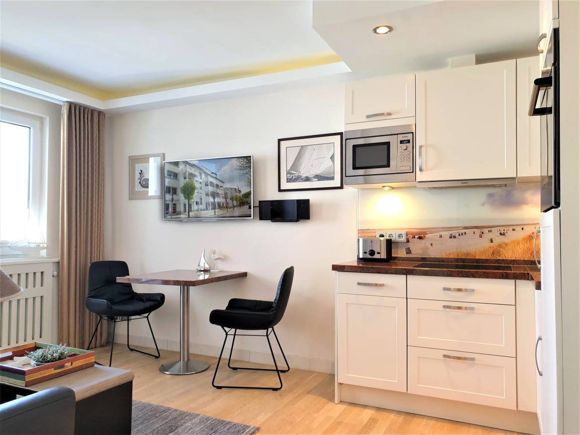 Im Wohnraum erwartet Sie eine offene Küche mit Granitarbeitsplatte, Granitesstisch, Einbaugeräten (Mikrowelle, Geschirrspüler, Backofen, Cerankochfeld, Kühlschrank mit Gefrierfach) und Kleingeräten (Kaffeemaschine, Wasserkocher, Toaster), ein 42 Zoll LED-Flachbildfernseher, Stereoanlage (Radio/CD/Airplay Funktion und iPhone Docking Station), Video-Gegensprechanlage, kostenfreier unbegrenzter Internetzugang über WLAN und LAN sowie ein Ledersofa. Der Schlafraum verfügt über ein komfortables Markenboxspringbett mit hochwertigen Matratzen, einem identischen 42 Zoll Flachbildfernseher, Kleiderschrank etc. In beiden Zimmern ist Eichenparkett ausgelegt und alle Fenster sind mit Plissees versehen. Der 8 m² große und mit verstellbaren Teakholzmöbel ausgestattete Balkon ist von beiden Zimmern begehbar. Er ist komplett überdacht und windgeschützt platziert. Das moderne Natursteinbad verfügt über eine große ebenerdige Dusche, Fußbodenheizung, fest installierten Fön, Handtuchtrockner und Kosmetikspiegel. Für Kleinkinder ist diese Wohnung nicht geeignet.