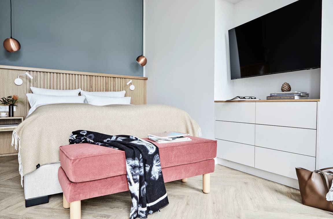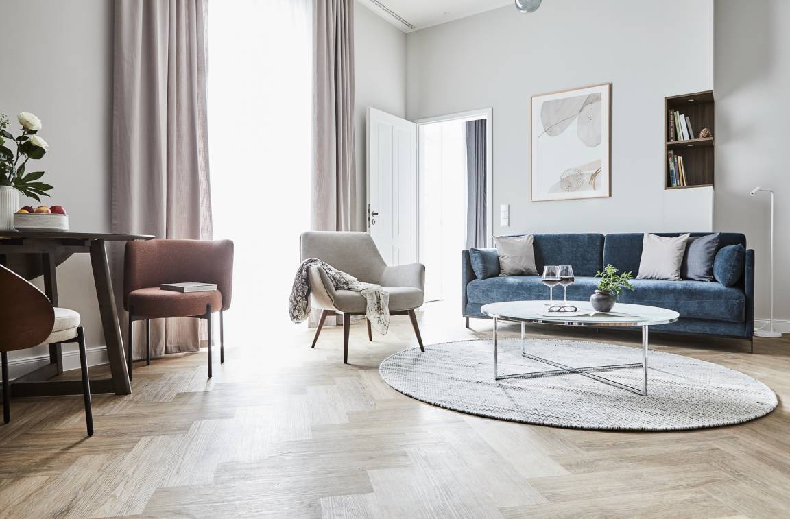 Die Deluxe Suite mit Balkon und Kamin befindet sich im Erdgeschoss und verfügt über geräumige ca. 61 m², über einen separaten Schlaf-/Wohnraum, eine offene Küchenzeile und ein Badezimmer. Der Balkon ist nach Osten gelegen.