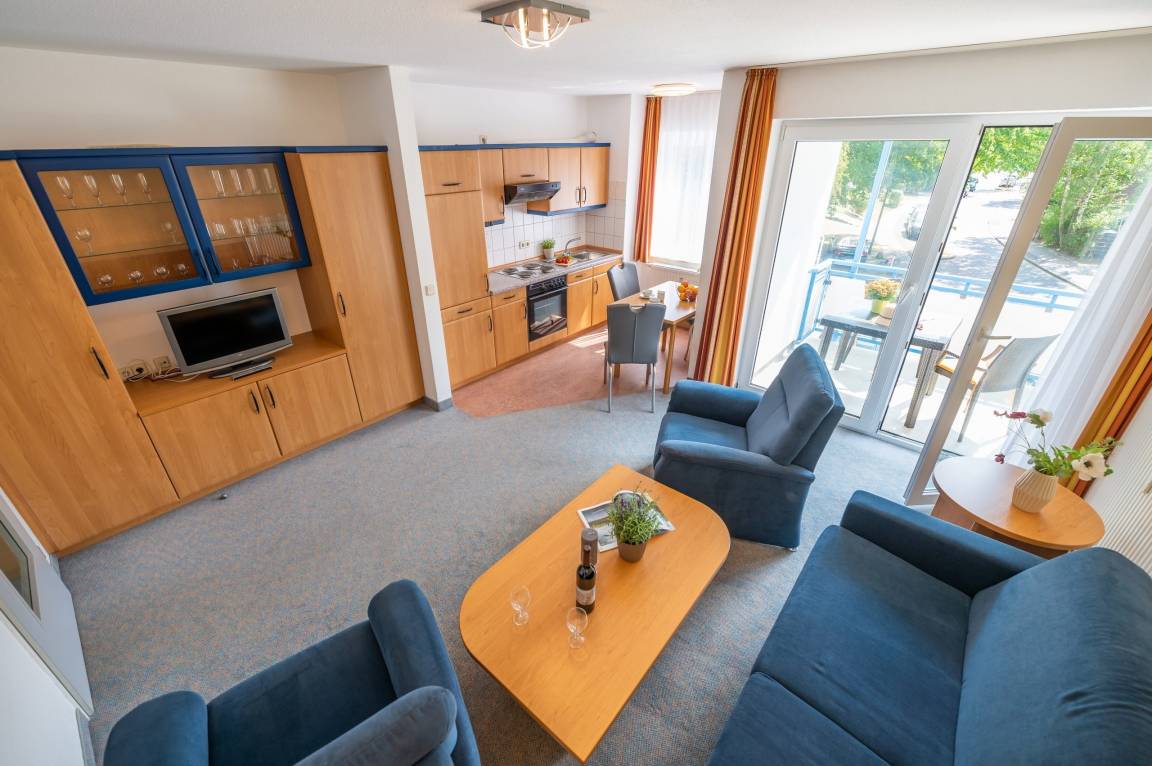 Das Apartment hat ein separates Schlafzimmer mit einem Doppelbett und einem Kleiderschrank, ein Bad mit Dusche und ein Wohn- und Esszimmer. Das Wohnzimmer verfügt über ein Sofa mit Schlaffunktion für zwei Personen. Die voll ausgestattete Küchenzeile bietet u.a. einen Backofen, einen Kühlschrank mit Tiefkühlfach und einen Geschirrspüler. Das Apartment besitzt ebenfalls einen Balkon mit südöstlicher Ausrichtung mit Stühlen und einem Tisch auf dem Sie die Sonne in Ruhe genießen können. Ein Flachbild Fernseher für regnerische Abende für Unterhaltung.
