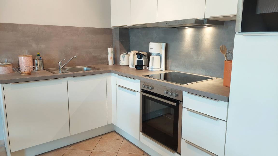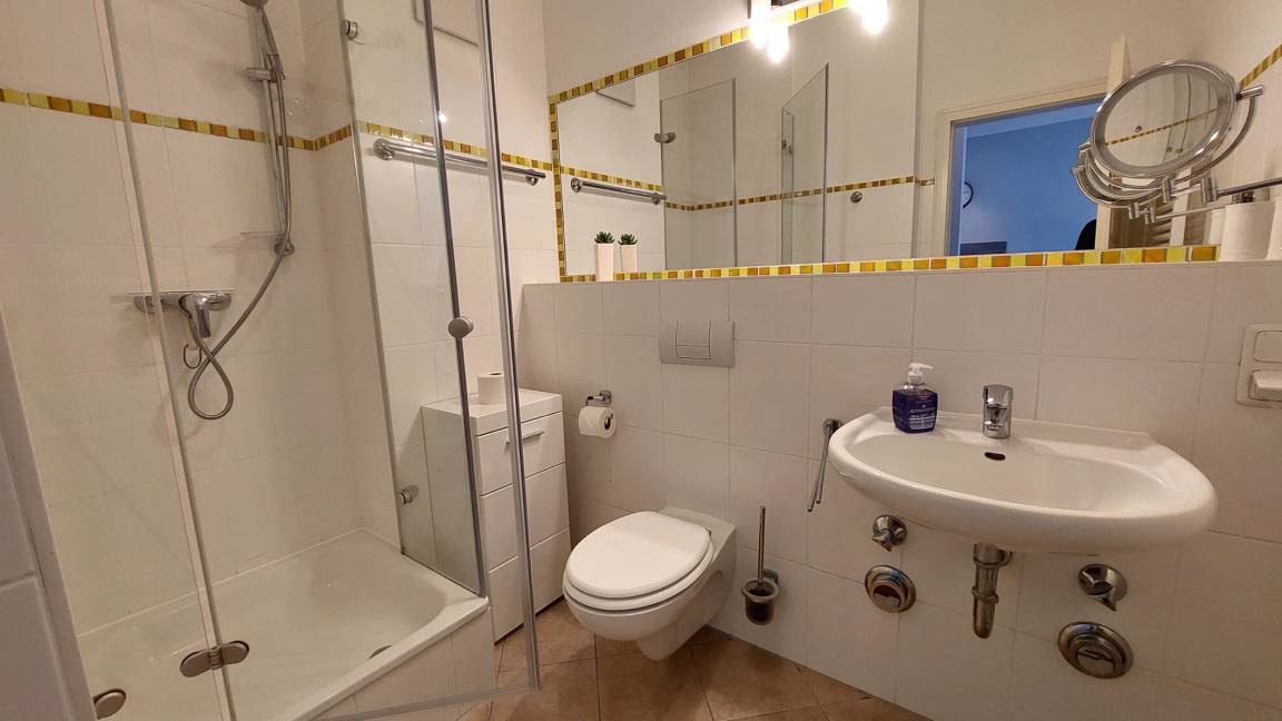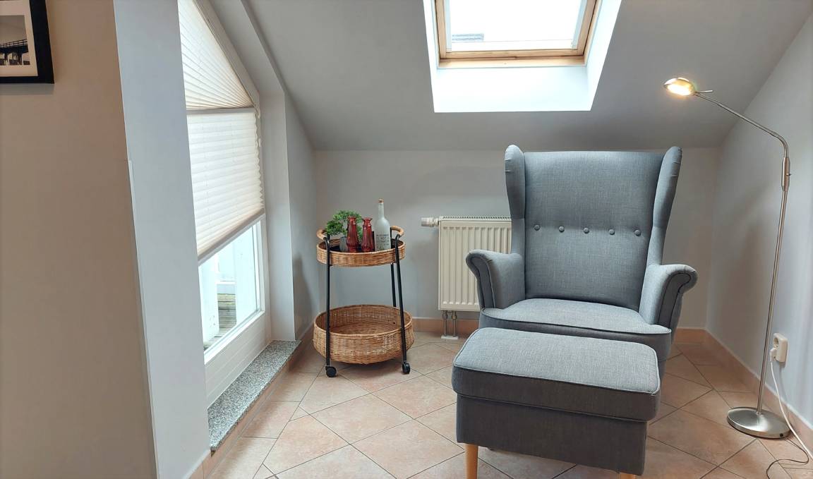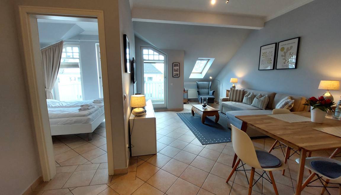 Neben dem hellen und großzügigen Wohnraum mit integrierter moderner Küche gibt es einen separaten Schlafraum, Flur und ein Badezimmer mit Waschtisch, Dusche, Kosmetikspiegel und WC. Im Schlafraum erwartet Sie ein Doppelbett, ein Kleiderschrank sowie ein zusätzlicher Flachbildfernseher. Im Wohnraum können auf dem Schlafsofa zwei weitere Personen schlafen. Hier finden Sie zudem einen Flachbild-TV, einen kostenfreien WLAN-Zugang und eine Musikanlage. Die Küche ist im Jahr 2023 neu mit Geschirrspülmaschine, Kühlschrank, Backofen, Mikrowelle, Kühlschrank mit Gefrierfach und diversen Kleingeräten komplett ausgestattet.