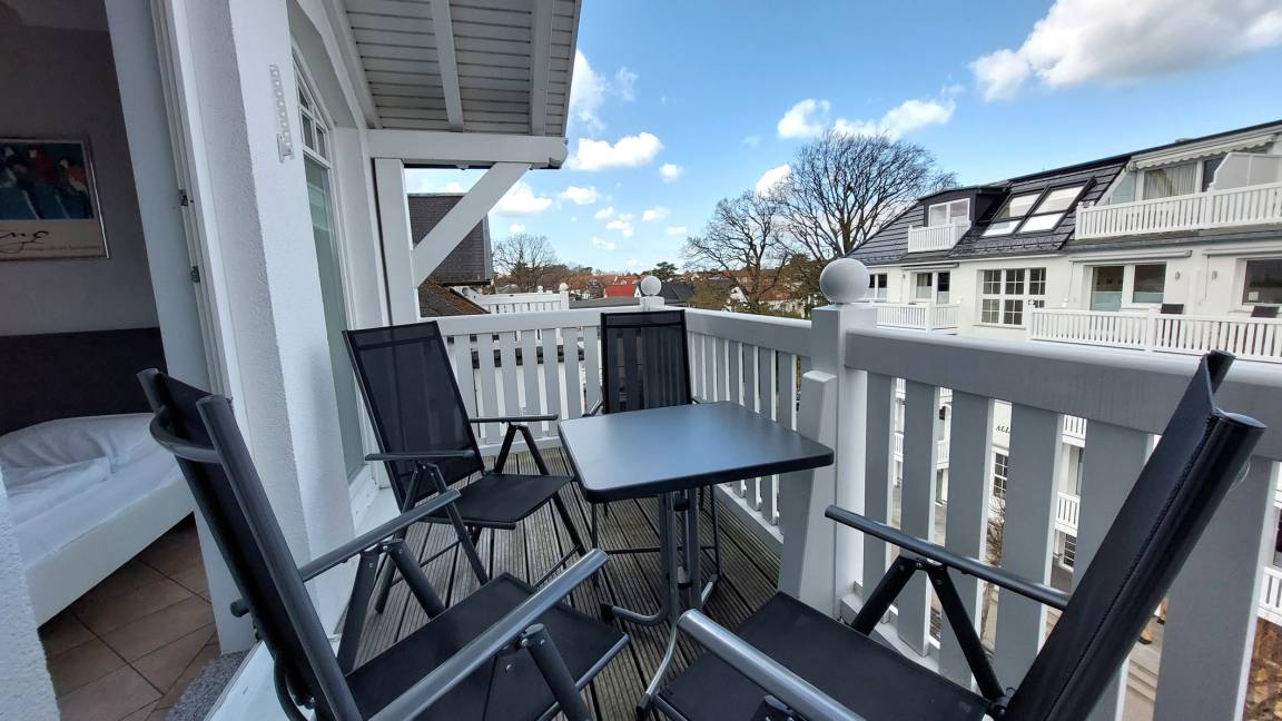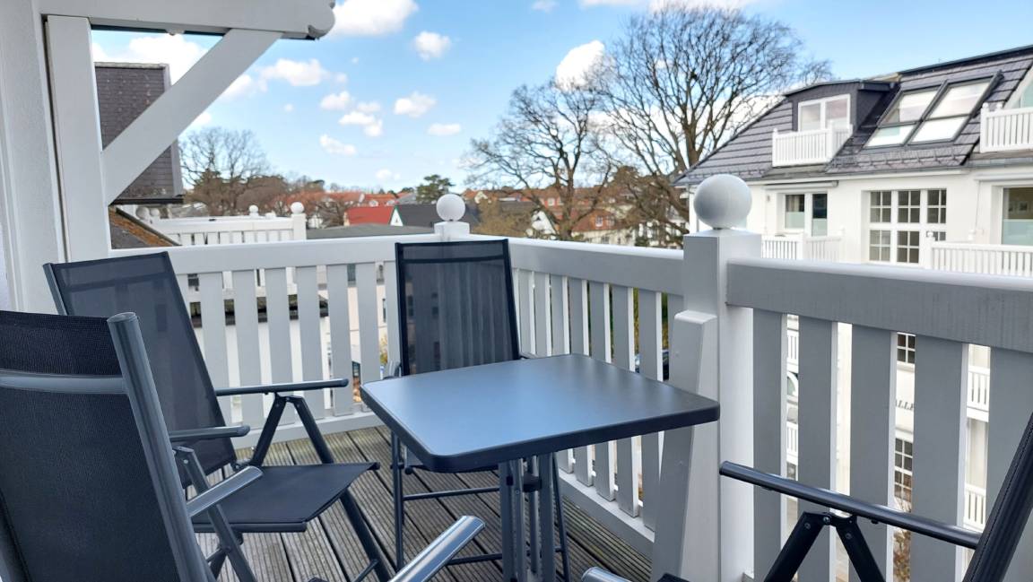 Vom Ostbalkon der Wohnung haben Sie einen schönen Blick auf die ruhige Paulstraße und über die Dächer von Binz.
