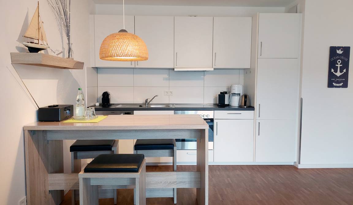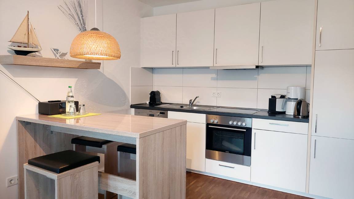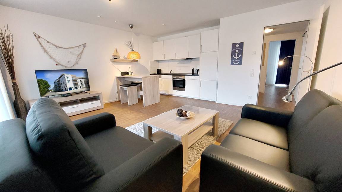 Die Wohnung verfügt über einen Flur mit Garderobe sowie Wandspiegel, einen gemütlichen Wohnbereich mit moderner Wohnküche sowie einen Essplatz im Barstil, ein schickes Schlafzimmer sowie Badezimmer. Im Wohnbereich erwartet Sie eine bequeme Sitzecke (mit Schlaffunktion) sowie Verdunklungsstoffen für einen erholsamen Schlaf. Darüber hinaus gelangen Sie vom Wohnzimmer auf den möblierten Balkon. Die technische Einrichtung umfasst einen großen Ultra-HD-Flachbildfernseher, Musikanlage mit CD-Player und Bluetooth-Funktion sowie einen gebührenfreien WLAN-Zugang. In der komplett ausgestatteten Küchenzeile erwartet Sie unter anderem ein Backofen, Mikrowelle, Cerankochfeld, Geschirrspüler, Kühlschrank mit Gefrierfach, Kapselmaschine von Nespresso, Toaster, Wasserkocher sowie umfangreiches Kücheninventar. Das Schlafzimmer verfügt über ein modernes Boxspringbett, einen großzügigen Kleiderschrank mit Spiegel sowie Verdunklungsstoffe für eine erholsame Nachtruhe. Ein separater Abstellraum bietet zusätzlichen Stauraum für Koffer sowie Strandutensilien. Das Bad ist mit ebenerdiger Dusche, Waschbecken, Fön und WC ausgestattet.