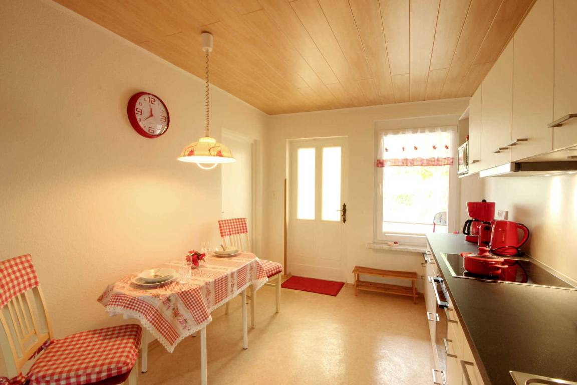 Beim Betreten der freundlichen Ferienwohnung kommen Sie direkt in die Küche mit Essbereich. Hier stehen Ihnen neben Backofen, Cerankochfeld, Geschirrspüler, Kaffeemaschine, Toaster, Wasserkocher, Mikrowelle, Kühlschrank mit kleinem Gefrierfach auch diverse andere Küchenhelfer zur Verfügung.