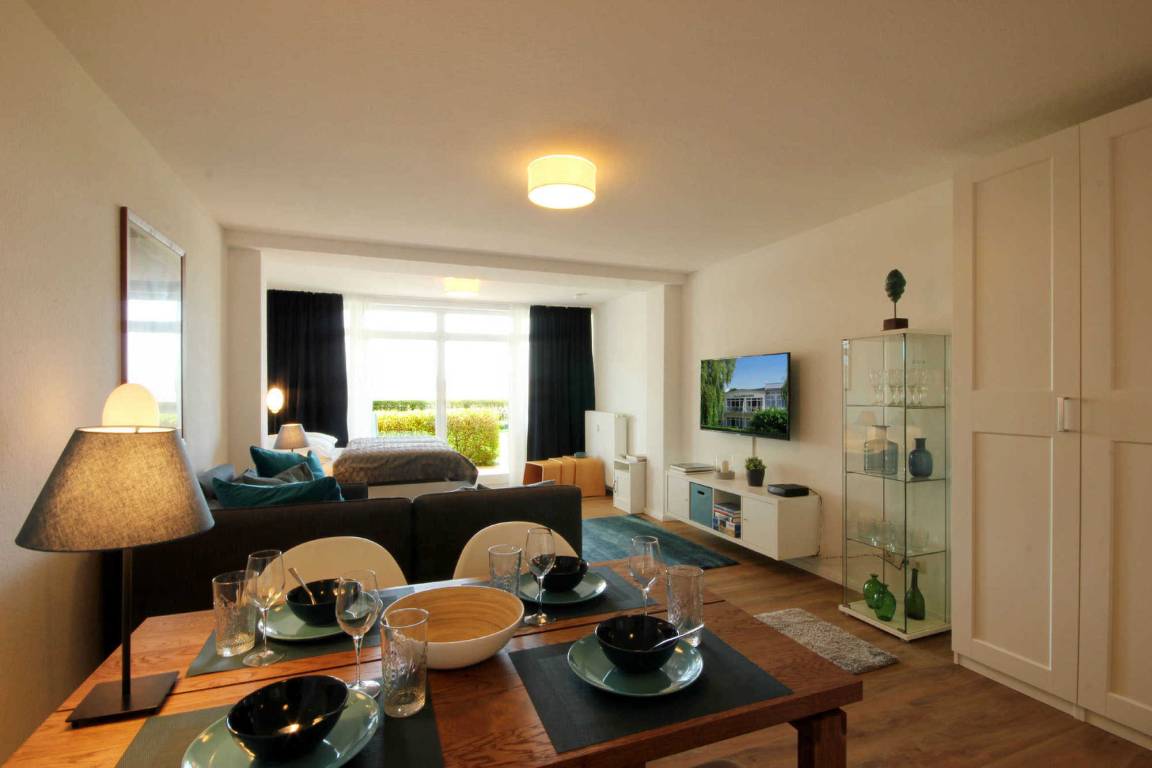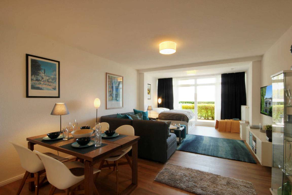 Ihre geräumige 1-Raum Nichtraucher - Ferienwohnung 37RB7 hat eine Größe von ca. 40 qm und ist für max. 2 Personen eingerichtet. Sie befindet sich im Erdgeschoss der Villa. Die dazugehörige Südterrasse mit einem wunderschönen Blick bis hin zum Schmachter See lädt zum Sonnenbaden und Verweilen ein. Die helle Ferienwohnung ist aufgeteilt in einen kombinierten Wohn- und Schlafraum, eine offene sowie moderne Küche und ein Tageslichtbad mit Dusche Waschtisch, WC und Kosmetikspiegel. Das Wohnzimmer ist mit einer gemütlichen Sitzgruppe sowie separatem Doppelbett möbliert. Die technische Ausstattung beinhaltet ein Flachbildfernseher, WLAN und eine Musikanlage. Die Wohnküche mit zusätzlichem Essplatz ist mit Kühlschrank, Backofen, Cerankochfeld, Kaffeemaschine und weiteren Elektrogeräten komplett ausgestattet. Ein PKW-Stellplatz steht Ihnen im nahegelegenen Parkhaus (ca. 150m vom Objekt entfernt) kostenfrei zur Verfügung.