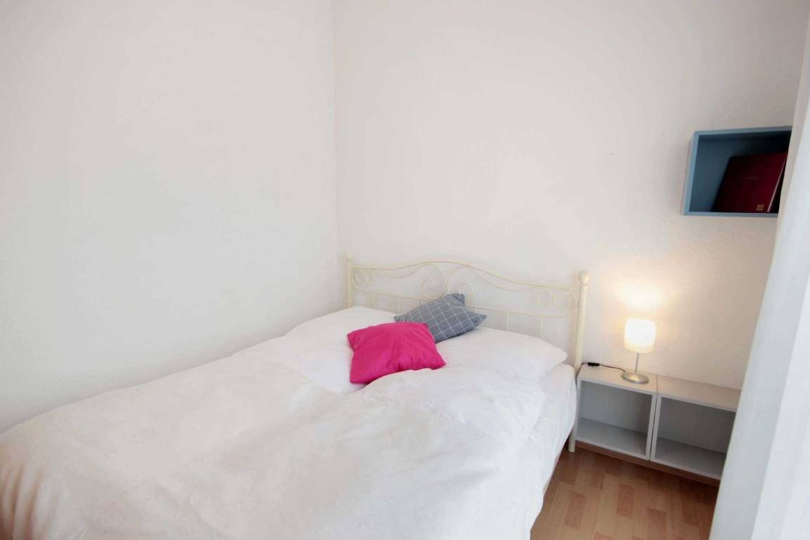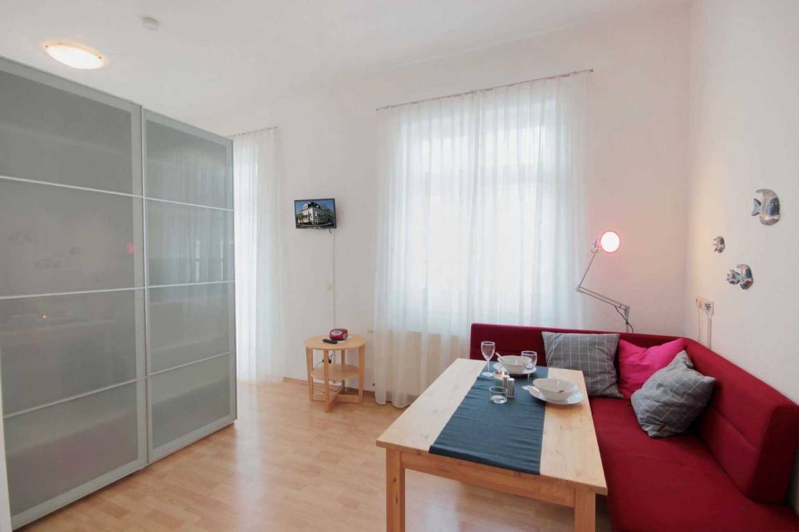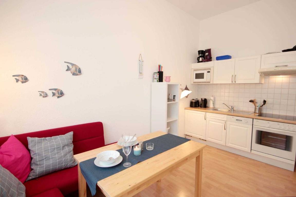 Im kombinierten Wohn- und Schlafraum befindet sich eine komplett ausgestattete Küchenzeile mit Geschirrspüler, Backofen, Ceranfeld, Kühlschrank, Mikrowelle, Kaffeemaschine, Wasserkocher und Toaster. Der Schlafbereich erwartet Sie mit einem französischen Doppelbett und einen Kleiderschrank als Raumteiler.
