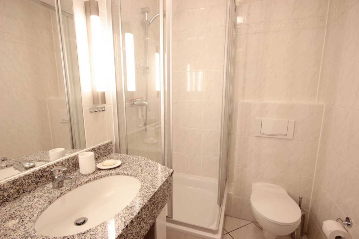 Vom vorgelagerten Flur aus erreichen Sie das Duschbad mit Waschtisch und WC. Im Wohnraum gibt es eine Sitz- und Essecke sowie ein Flachbild-TV und ein Radio mit CD-Player.
