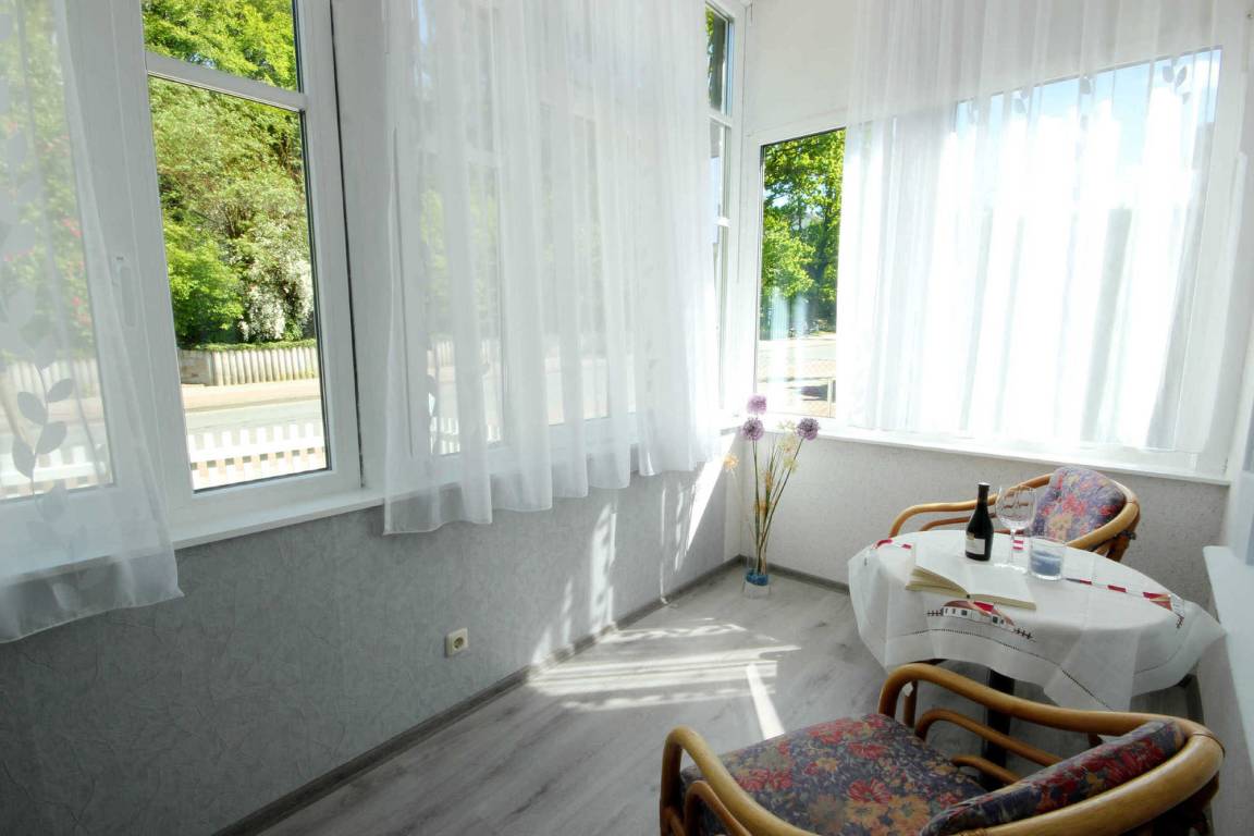 Ihre Ferienwohnung 218RB3 (Nichtraucher) befindet sich in der Hochparterre der Villa Wilhelmshöhe. Die geräumige 2 - Zimmer - Wohnung hat eine Größe von ca. 65 qm und ist mit bis zu 4 Personen belegbar. Nicht nur der gemütliche beheizbare Wintergarten sondern auch die kleine Terrasse laden zum Verweilen ein. Neben dem Wohnraum mit angrenzendem Wintergarten, gibt es einen Schlafraum, eine separate Küche sowie ein Tageslichtbad mit Waschtisch, Dusche, Fön und WC. Der gemütliche Wohnbereich mit Zugang zum Wintergarten erwartet Sie mit einer Sitzecke, welche die Schlafmöglichkeit (1,30m x 2,00m) für die 3. und 4. Person bietet sowie Flachbild-TV und WLAN. Der Schlafraum ist mit einem Doppelbett und einem Kleiderschrank ausgestattet. Die Küche mit Essbereich und Zugang zur kleinen Terrasse verfügt über ein Ceranfeld, einen Kühlschrank mit Gefrierfach, Backofen, Geschirrspüler, Kaffeemaschine, Wasserkocher und diverse andere „Küchenhelfer". Ein PKW-Stellplatz steht Ihnen für die Zeit Ihres Aufenthalts direkt am Haus zur Verfügung. Im Garten befindet sich eine Wäschespinne, die Sie gern nutzen dürfen.