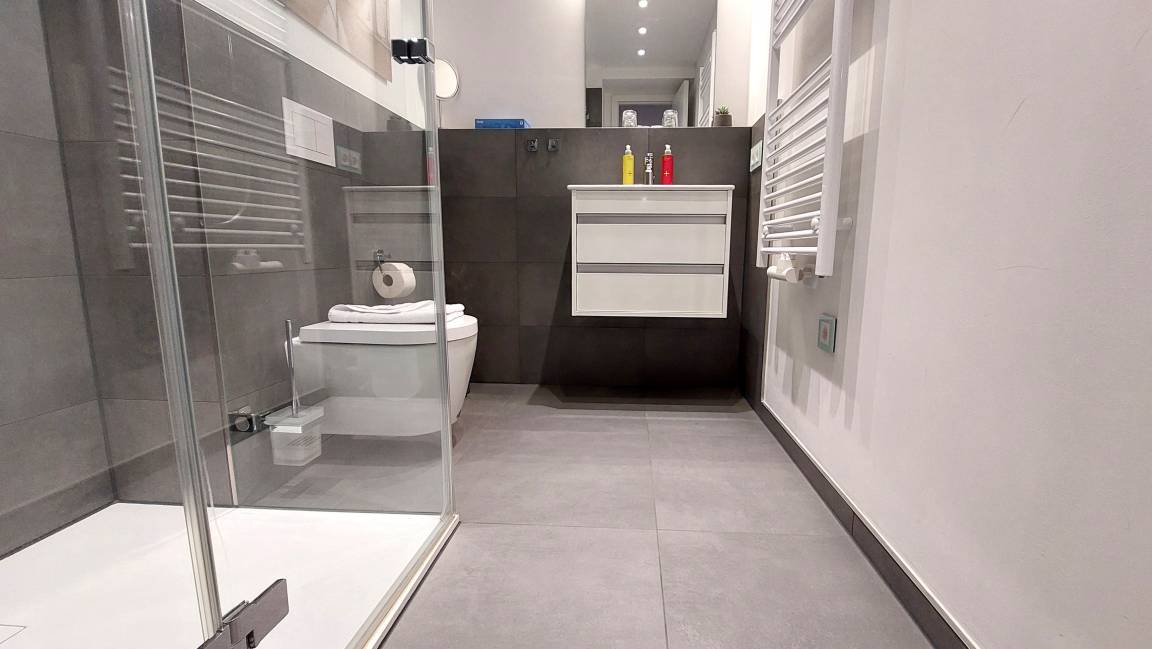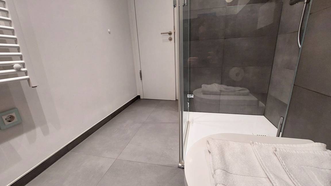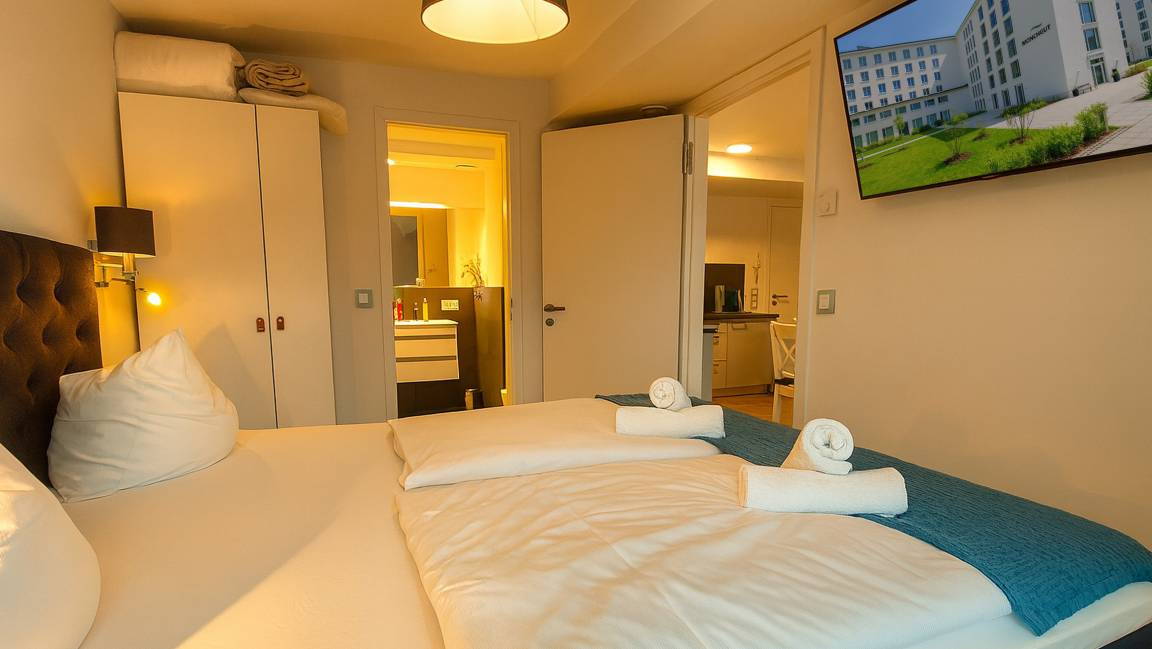 Die Wohnung verfügt über 2 vollwertige Schlafzimmer, jeweils mit einem Doppelbett, Kleiderschrank und eigenem Fernseher. Eines der Schlafzimmer hat außerdem ein eigenes Badezimmer ("Bad en Suite"). Das zweite Badezimmer ist ebenfalls ausgestattet mit WC, Waschtisch und ebenerdiger Dusche.