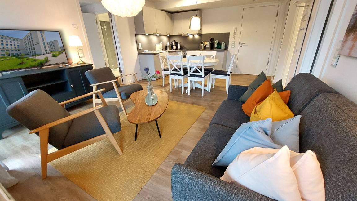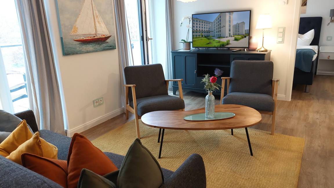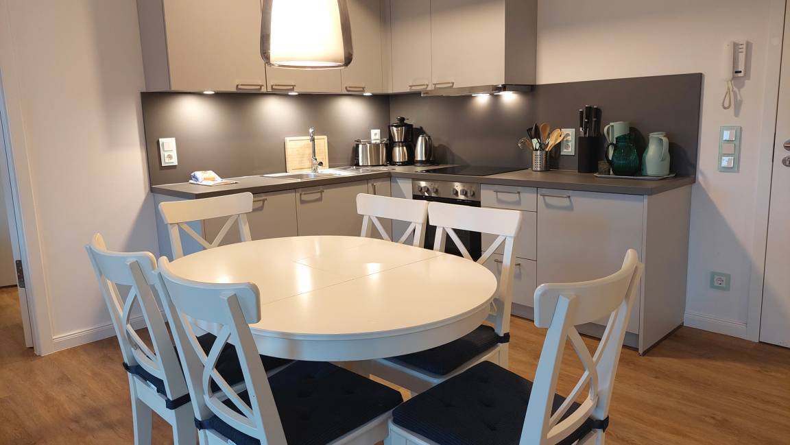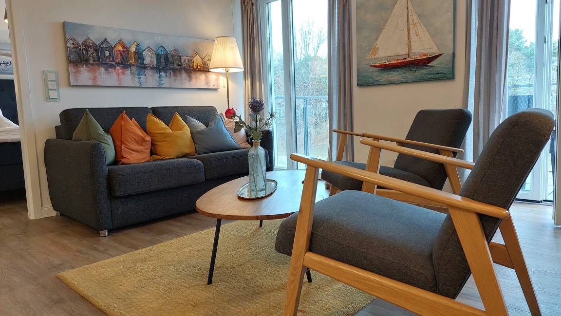Das Wohn- und Esszimmer ist das Zentrum der Wohnung und lädt mit einer ausklappbaren Sofalandschaft zum Entspannen ein. Für Unterhaltung bei jedem Wetter gibt es einen Smart-TV und kostenfreies WLAN. Der Essbereich bietet Platz für 6 Personen und vom möblierten und überdachten Balkon aus hat man einen Blick auf den angrenzenden Küstenwald und die Ostseedünen.