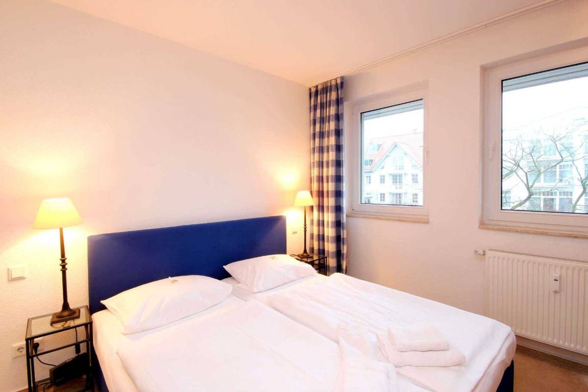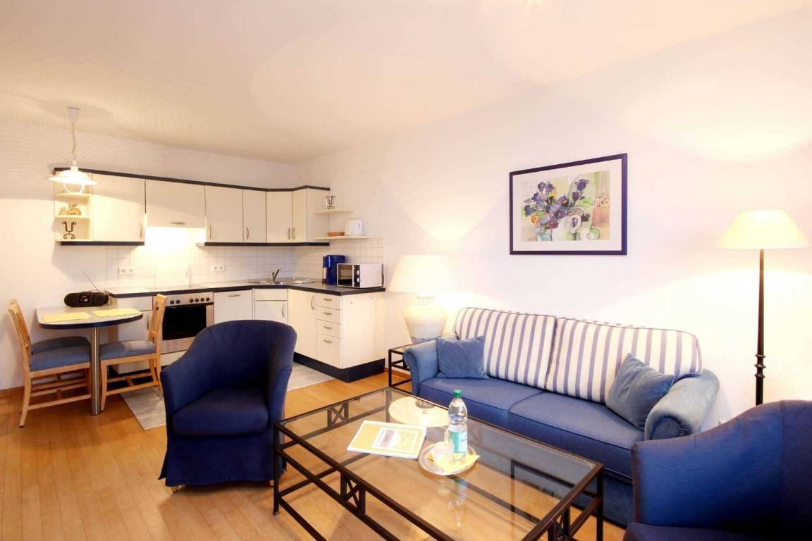 Ihre Ferienwohnung 24RB16 liegt im 2. Obergeschoss des Hauses. Sie hat einen schönen Südostbalkon auf dem Sie vom Morgen bis zum Nachmittag die Sonne genießen können und von dem Sie einen kleinen Meerblick haben. Die schöne 2 Raum Wohnung ist ca. 55 qm groß und für maximal 4 Personen eingerichtet. Das Wohnzimmer mit Sitzgruppe und TV ist gemütlich eingerichtet. Die Küchenzeile ist im Wohnbereich integriert und u.a. mit Ceranfeld, Geschirrspüler, Kühlschrank und Backofen ausgestattet. Im Schlafraum befindet sich ein Doppelbett und ein großer Kleiderschrank. Im Wohnraum können auf dem Schlafsofa die 3. und 4. Person schlafen. Das Bad ist vom Flur aus erreichbar und mit Dusche, WC und Waschtisch ausgestattet. Haustiere sind in dieser Wohnung nicht erlaubt. Ein kostenfreier Internetzugang und ein wohnungseigener Parkplatz steht für Sie in der Garage unter dem Haus zur Verfügung.