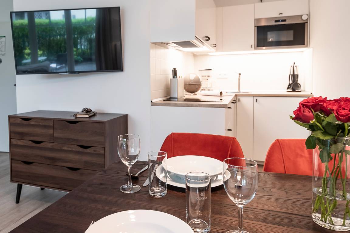 Erdgeschoß, ca. 45 m², kombinierter Wohn- und Schlafraum, komplett ausgestattete Küchenzeile,