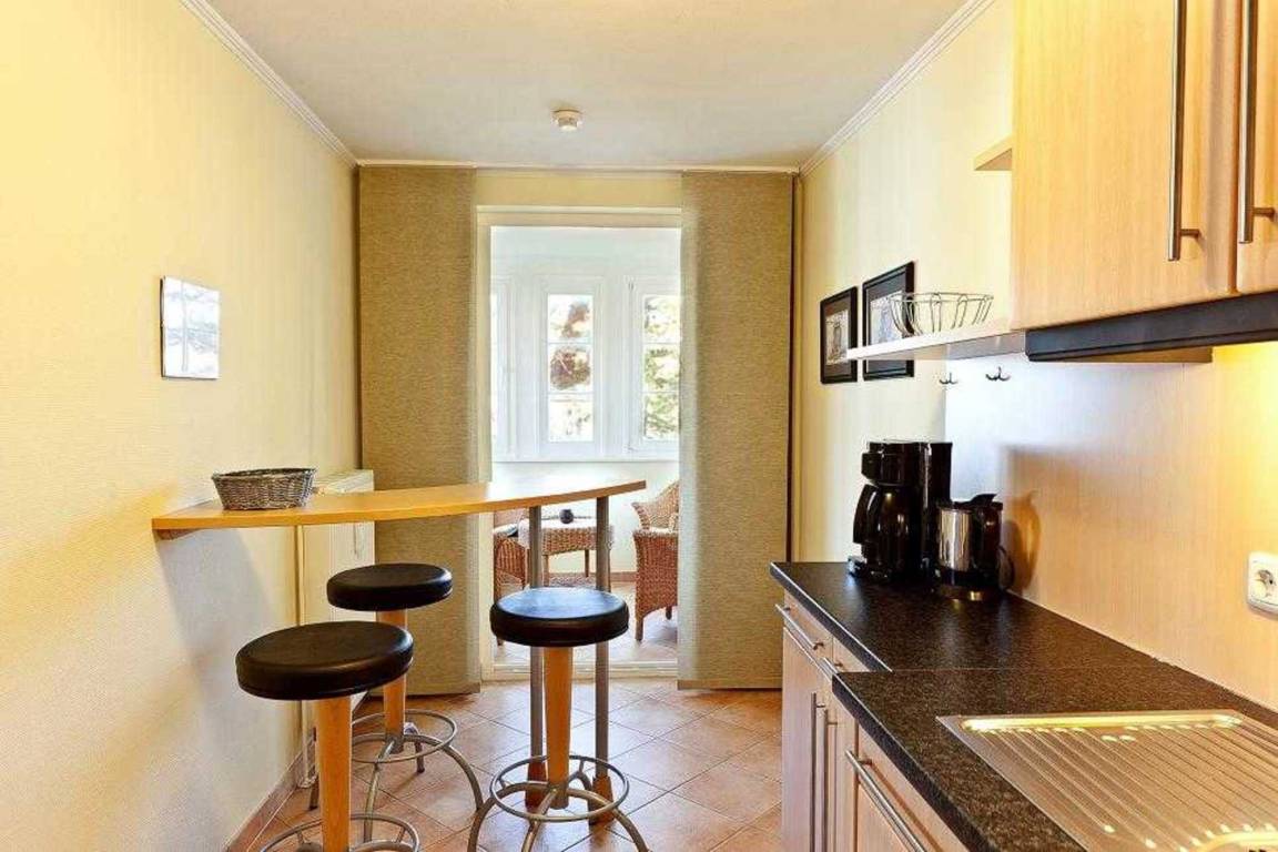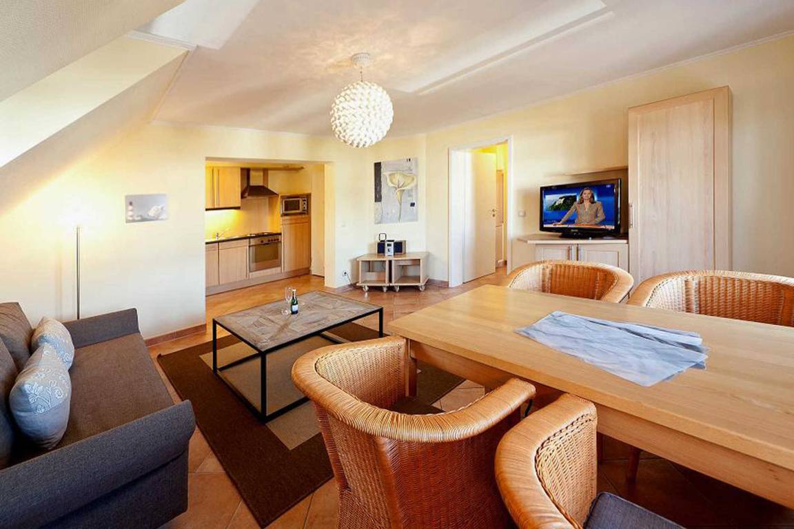 Ihre gemütlich eingerichtete Nichtraucher-Ferienwohnung 3RB8 befindet sich im 2. Obergeschoss. Die 2-Raumwohnung mit Wintergarten hat eine Größe von ca. 56 qm und ist mit bis zu 4 Personen belegbar. Das Appartement ist aufgeteilt in einen schönen Wohnraum mit Essplatz, separate Küche mit Tresen, ein Schlafzimmer mit Doppelbett, Kleiderschrank sowie einem kleinen Tisch mit Spiegel und Sitzgelegenheit, einem hellen Wintergarten und ein Badezimmer mit Waschbecken, Dusche, Wandheizung, festinstalliertem Fön und WC. Im separaten Wintergarten finden Sie eine zusätzliche Sitzmöglichkeit die zum Verweilen einlädt. Im Wohnzimmer befindet sich neben dem Schlafsofa für 2 weitere Personen, ein Full HD - TV und Radio/CD-Player. Die Küche ist mit Backofen, Cerankochfeld, Kühlschrank, Mikrowelle und diversen Kleingeräten komplett ausgestattet.