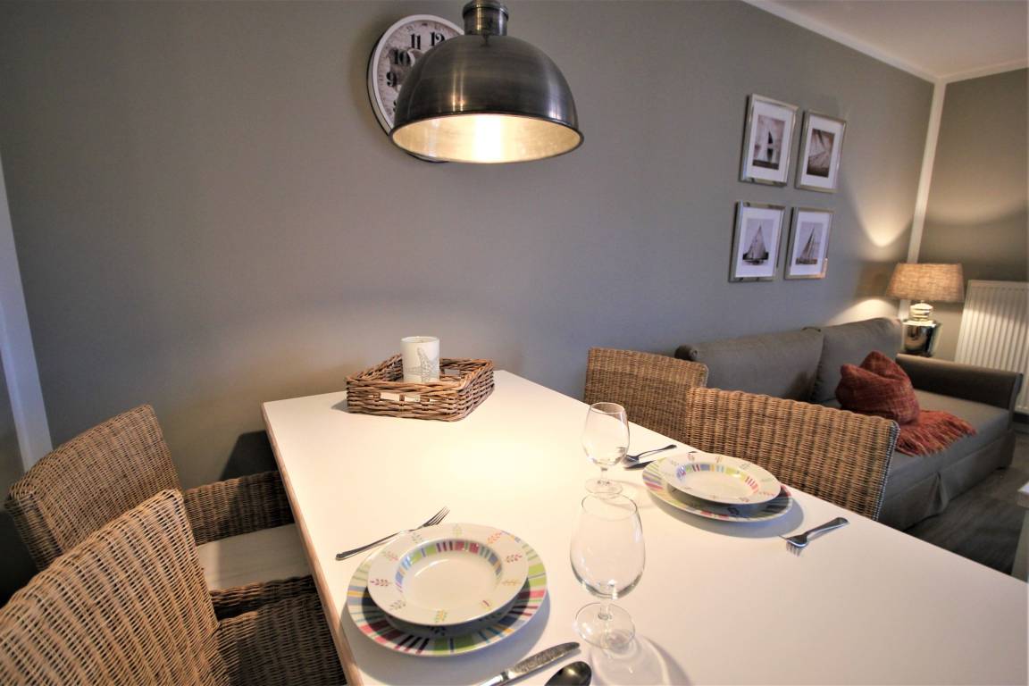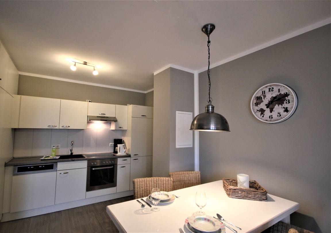 Ihre 2-Zi. Wohnung 219RB11 (Nichtraucher) besitzt eine Größe von ca. 57 qm und ist mit bis zu 4 Personen belegbar. Sie befindet sich im 1. Obergeschoss des Hauses. Auf dem Frühstücksbalkon werden Sie von der Morgensonne gekitzelt. Hier befindet sich auch ein Strandkorb, welcher zum Verweilen einlädt. Die moderne Ferienwohnung in Vintage-Optik teilt sich auf in einen Flur mit Garderobe und großem Schrank für Ihr Gepäck, einen Wohnraum mit offener Küche und Essbereich, ein separates Schlafzimmer sowie ein Duschbad. Der großzügige Wohnbereich verfügt über eine Sitzecke mit Schlaffunktion für die 3. / 4. Person, einen Flachbild-TV samt DVD-Player, Radio sowie einen gebührenfreien WLAN-Zugang. Im Schlafraum befindet sich ein Doppelbett, ein zusätzlicher TV und ein Kleiderschrank. Vom Schlafzimmer und auch vom Wohnbereich gelangen Sie auf den Balkon. Verdunklungsstoffe im Wohn- und Schlafbereich bereiten eine behagliche Nachtruhe. Die Küchenzeile ist mit Geschirrspüler, Ceranfeld, Backofen, Kühl-/Gefrierkombination, Kaffeemaschine, Wasserkocher, Toaster und anderen diversen Küchenhelfern komplett ausgestattet. Das Badezimmer verfügt über einen Waschtisch mit großem Spiegel, eine Dusche, WC und einen Handtuchheiztrockner. Ein kostenfreier Tiefgaragenstellplatz steht Ihnen während Ihres Aufenthaltes zur Verfügung. Rundum eine schön eingerichtete Wohnung, die zum Entschleunigen einlädt. Genießen Sie Ihren Urlaub und machen Sie diese Wohnung zu Ihrem zweiten Zuhause!