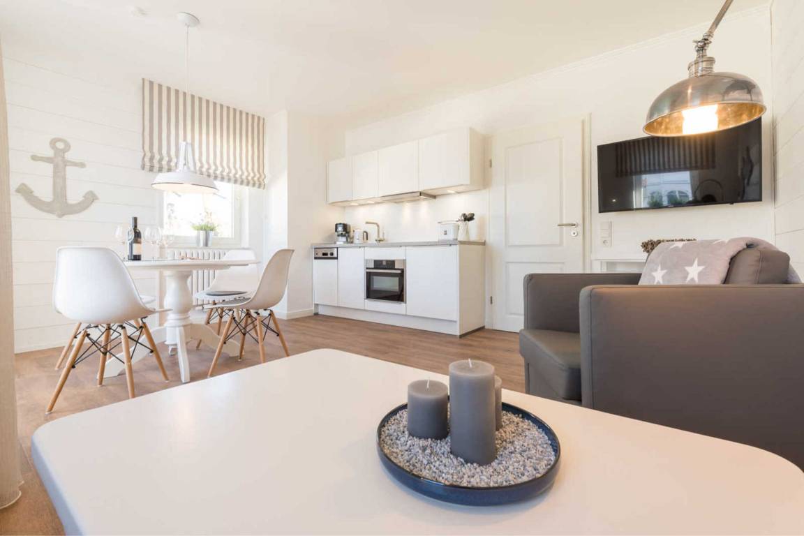 Neben dem Wohnraum mit offener Küche gibt es einen Schlafraum, sowie ein Badezimmer mit Waschtisch, Dusche und WC. Der Schlafraum ist mit einem Doppelbett, TV und einem großen Kleiderschrank ausgestattet. Außerdem finden Sie im komfortablen Wohnbereich neben der Sitzecke mit Schlafsofa für die 3. und 4. Person einen separaten Essplatz, TV mit integriertem Radio. Die moderne Küche ist mit Geschirrspülmaschine, Mikrowelle, Cerankochfeld, Kühlschrank und diversen Kleingeräten ausgestattet.