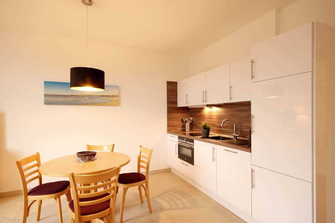 Ihre 2-Zimmer Ferienwohnung 225RB25 befindet sich im 2. Obergeschoss, ist ca. 55 qm groß und für bis zu 4 Personen gut geeignet. Neben dem gemütlichen Wohnbereich mit Schlafsofa, auf dem die 3. und 4. Person gut schlafen können, gehört ein Essbereich, Flachbild TV sowie WLAN zur Nichtraucherwohnung. Im Schlafzimmer erwartet Sie ein Doppelbett sowie der Zugang zum Balkon, von welchem Sie einen seitlichen Blick auf die Ostsee sowie auf die Binzer Bucht genießen können. Ebenfalls können Sie eine voll ausgestattete integrierte Küchenzeile mit Geschirrspüler, Nespresso-Maschine, Backofen, Mikrowelle, Wasserkocher, Toaster und Kaffeemaschine nutzen. Das Badezimmer erwartet Sie mit Waschtisch, WC und Dusche. Haustiere sind herzlich willkommen.