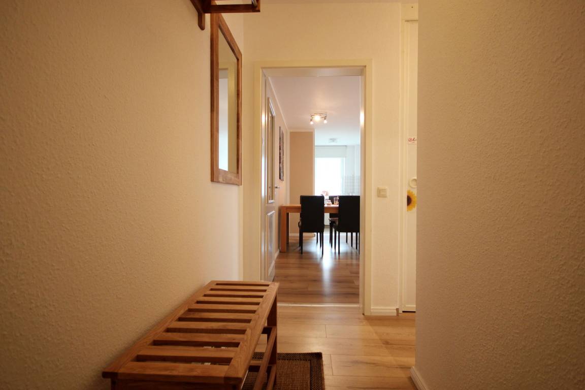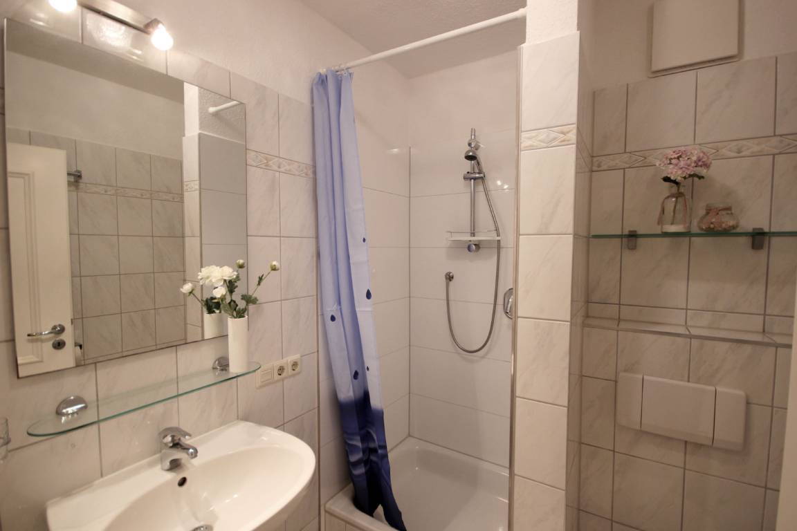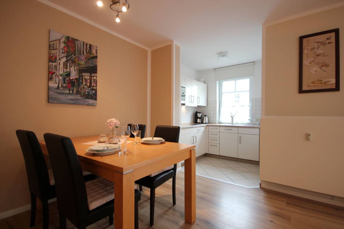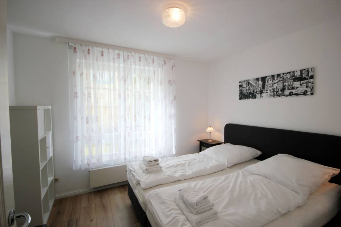 Ihre Ferienwohnung 1RB14 befindet sich im Erdgeschoss des Hauses und ist für bis zu 4 Personen ausgestattet. Auf dem überdachten Balkon nach Süden können Sie gemeinsam verweilen. Die 2 Zimmer - Wohnung hat eine Größe von ca. 50 qm. Neben dem Wohnraum mit integrierter Kochecke gibt es einen separaten Schlafraum, Flur und ein Badezimmer mit Waschbecken, Dusche und WC. Im Schlafraum befindet sich ein gemütliches Doppelbett. Ein Kleiderschrank befindet sich im Flurbereich der Wohnung. Im Wohnraum können auf dem Schlafsofa weitere zwei Personen schlafen. Außerdem finden Sie im Wohnraum neben der Sitzecke einen separaten Essplatz, Flachbild-TV, Musikanlage und WLAN. Die Kochecke ist mit Geschirrspüler, Kühlschrank mit kleinem Gefrierfach, Mikrowelle, Kaffeemaschine, Wasserkocher, Toaster und weiteren Küchenutensilien komplett ausgestattet. Ein wohnungseigener Parkplatz steht für Sie direkt am Haus zur Verfügung. Den Münz-Waschtrockner können Sie im Keller des Hauses nutzen. Der Fahrradabstellraum befindet sich nebenan.