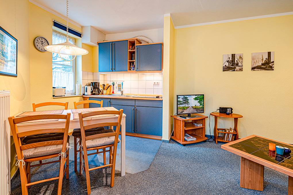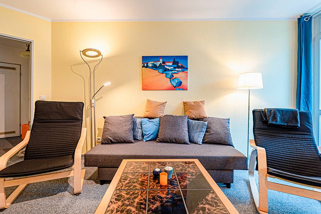 D 90.30 Wohnung 2-4 Pers.: Geschmackvolle 2-Zimmerwohnung mit 42 qm Wohnfläche, 1. Etage. Großer, heller Wohn-/Essraum mit Couchgarnitur (Ausziehcouch 2 Pers.), Kabel-TV, Radio, Esstisch, moderner Küchenzeile. Doppelzimmer. Bad/WC. Balkon mit Sitzmöbeln.