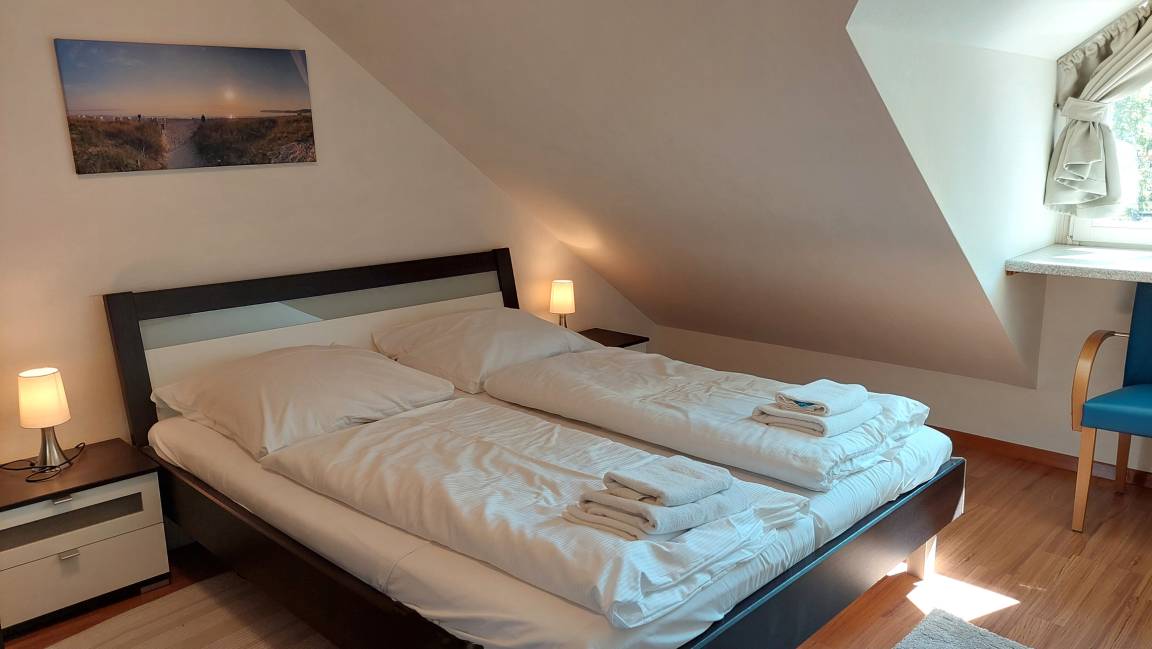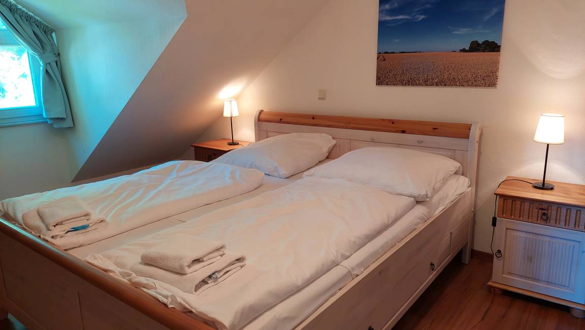 Beide Schlafzimmer verfügen über ein Doppelbett, Kleiderschrank und eine Verdunklungsmöglichkeit. Zusätzlich befindet sich im größeren Schlafzimmer ein Flachbild-TV.