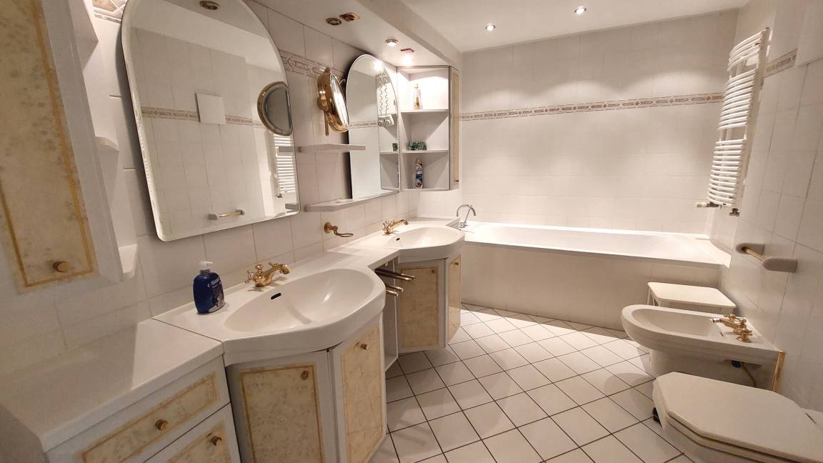 Das größere Badezimmer bietet eine Badewanne, ein WC, ein Bidet und 2 hochwertige Waschbecken samt Kosmetikspiegel.