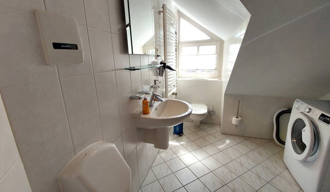 Im zweiten Bad erwartet Sie, neben Waschbecken und WC, ein Pissoir, eine ebenerdige hochwertige Dusche (mit Massagefunktion) und eine eigene Waschmaschine.