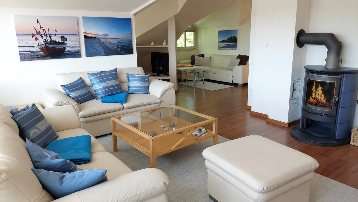 Das Highlight dieser familienfreundlichen Wohnung ist der großzügige und helle Wohnbereich, bestehend aus einem Essbereich im "Turmzimmer" und 2 Sofalandschaften mit Kamin und 43"-Smart-TV, welche zum Verweilen einladen.