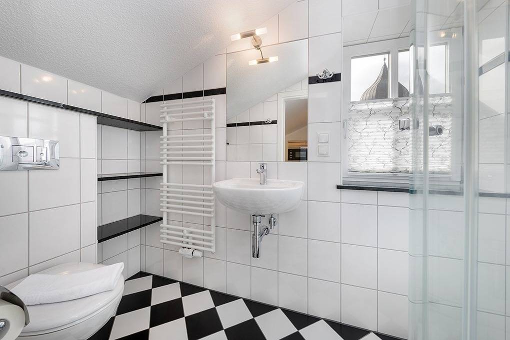 Kleines, modernes Badezimmer mit Fenster, Glasdusche, Waschtisch, Spiegel, WC, Handtuchheizkörper und Föhn (Dachschräge)