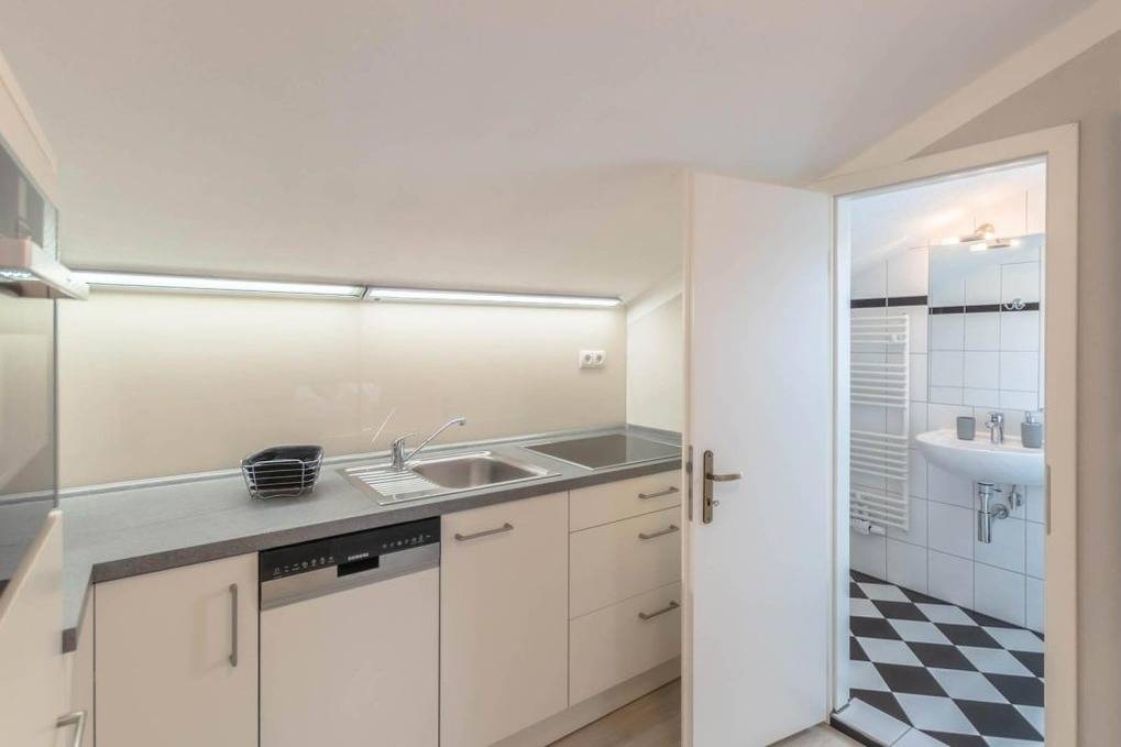 Separate, hochwertige Küche (Dachschräge, ohne Fenster), voll ausgestattet u. a. mit Spülmaschine, Kühlschrank mit Gefrierfach, Glaskochfeld mit Touchcontrol-Bedienung, Backofen mit integrierter Mikrowelle, Kaffeemaschine, Wasserkocher und Toaster.