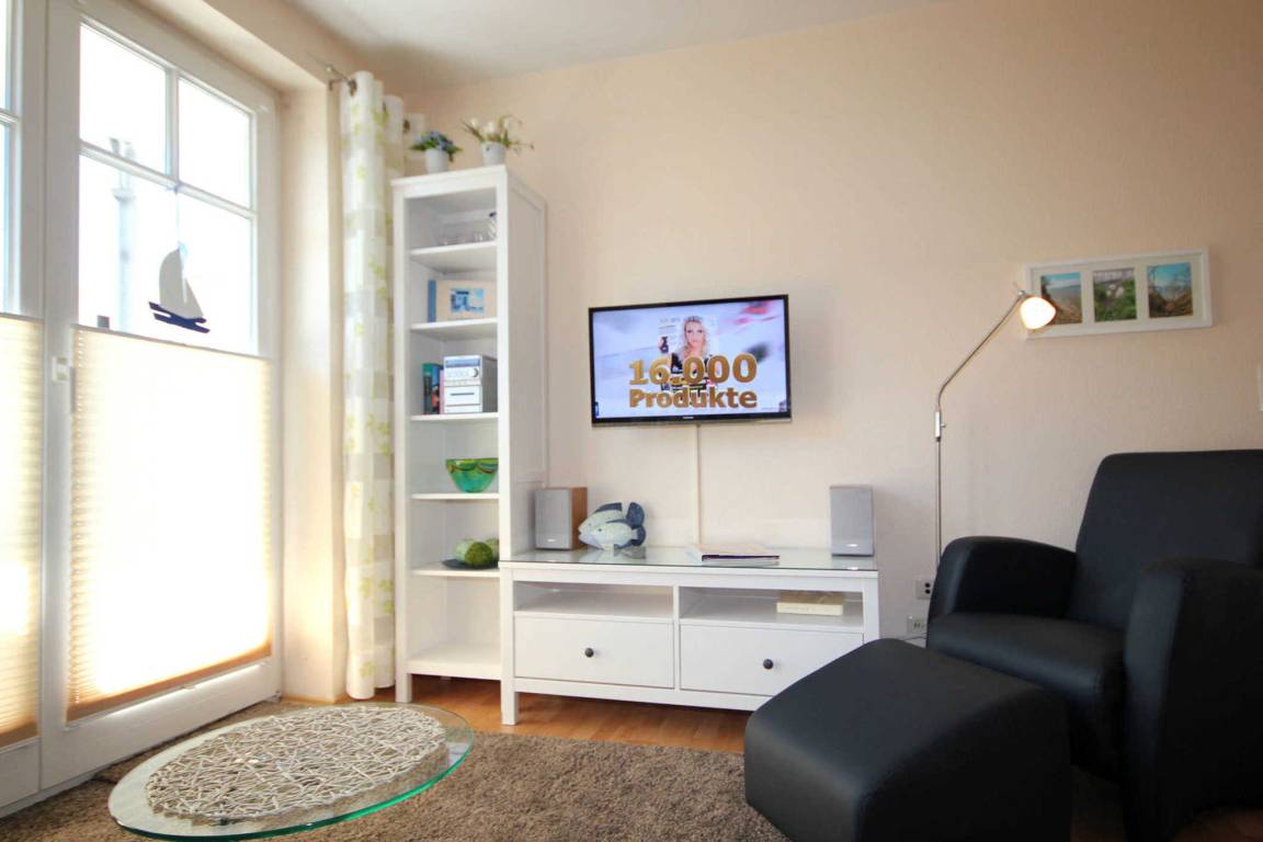 Dem hellen Wohnraum schließt sich die weiße Wohnküche und der Balkon an. Im separaten Schlafraum finden Sie ein Doppelbett und einen Kleiderschrank. Vom vorgelagerten Flur aus erreichen Sie das geräumige Duschbad mit Kosmetikspiegel und Fön. Im Wohnraum gibt es einen Essbereich und eine gemütliche Sitzecke mit Schlaffunktion sowie ein Flachbildfernseher und [nbsp]eine Musikanlage mit CD-Player. Die Küche verfügt über einen Backofen, eine Mikrowelle, Kühlschrank, Geschirrspüler, Kaffeemaschine, Toaster und Wasserkocher.