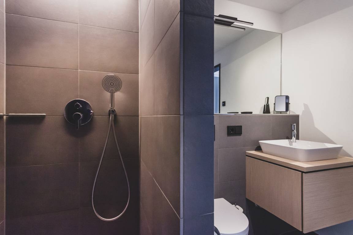 2 Schlafzimmer mit eigenem Bad, Sauna, Kamin und eine Dachterrasse mit atemraubendem Panorama.