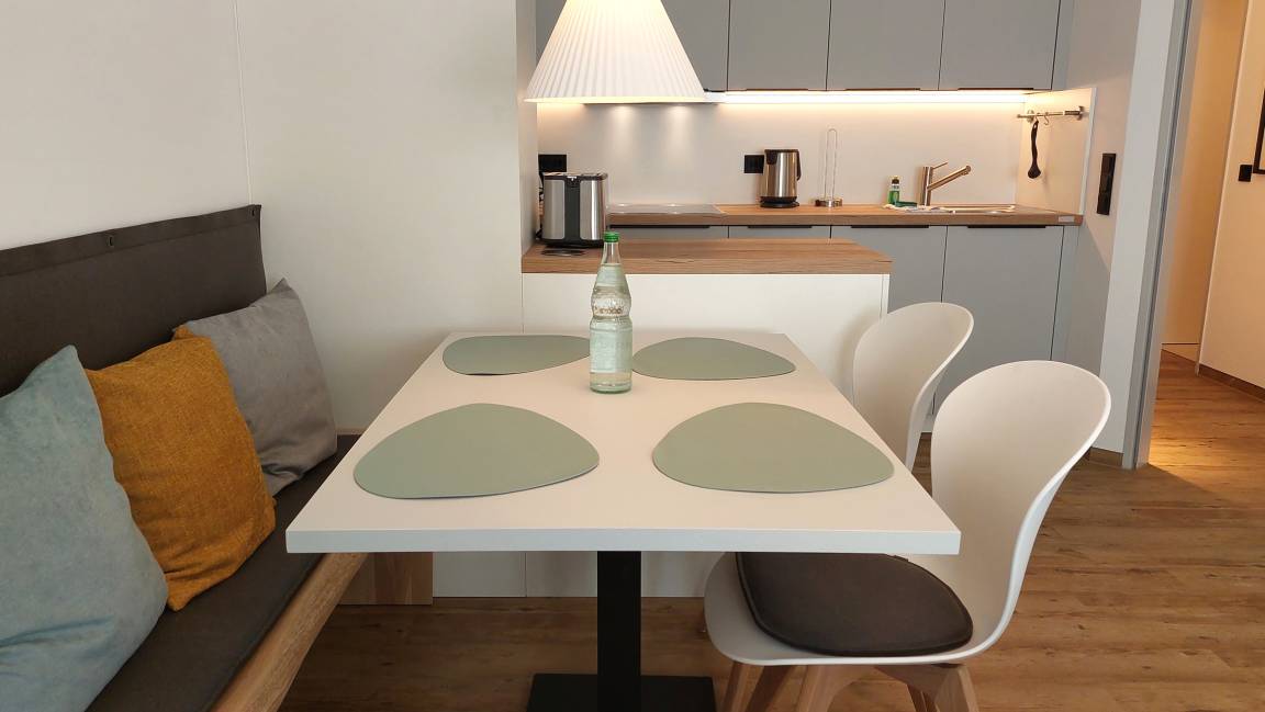 Es gibt einen Essbereich für 4 Personen sowie eine moderne Küchenzeile mit allen Möglichkeiten sich im Urlaub selbst zu verpflegen.
