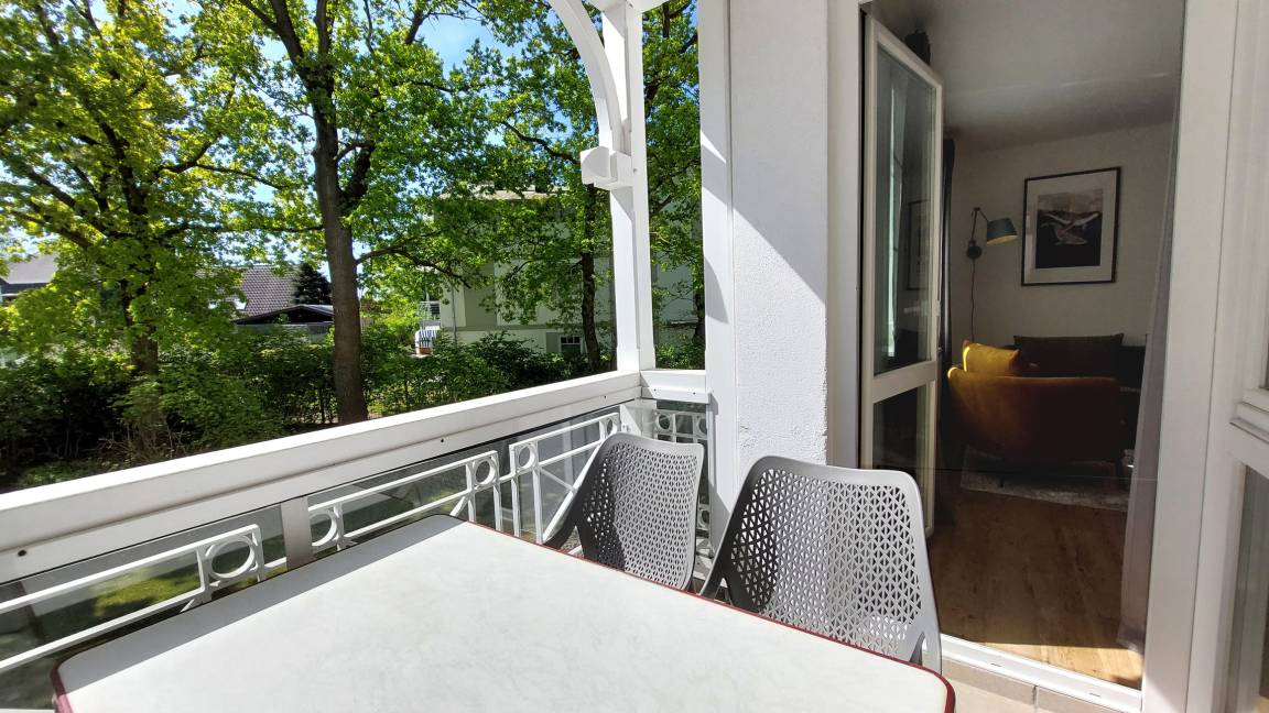 Auch vom Wohnbereich gelangen Sie auf den möblierten Balkon mit wunderbarem Blick ins Grüne.