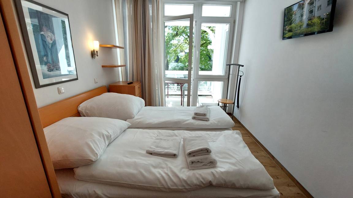 Beide Schlafzimmer verfügen jeweils über Doppelbetten mit Nachttischen, einen Kleiderschrank und einen TV.