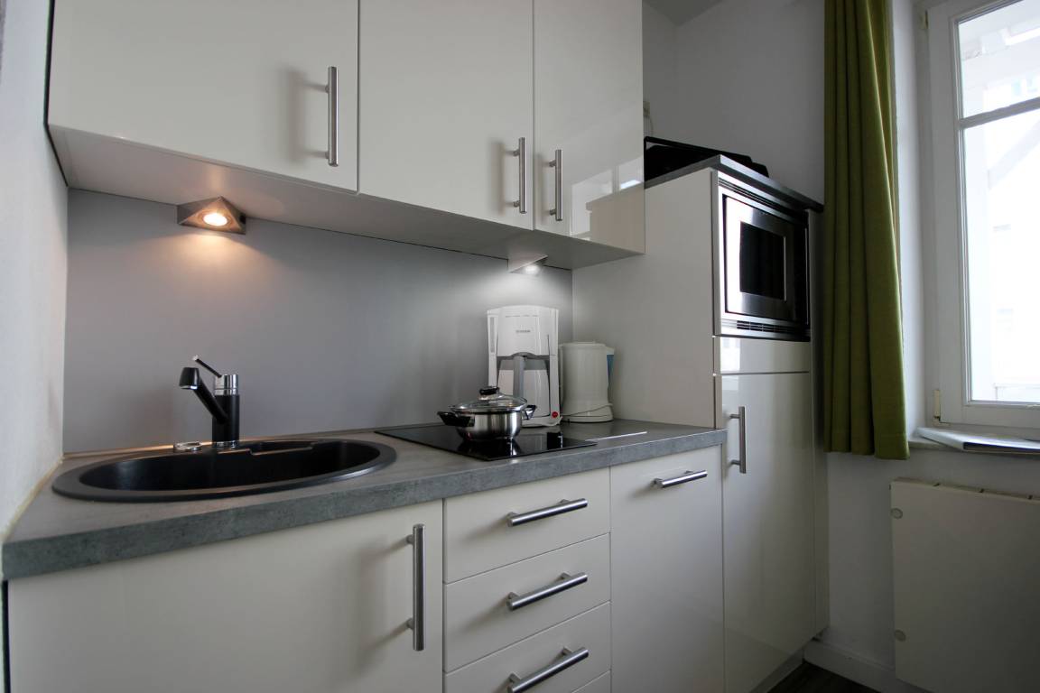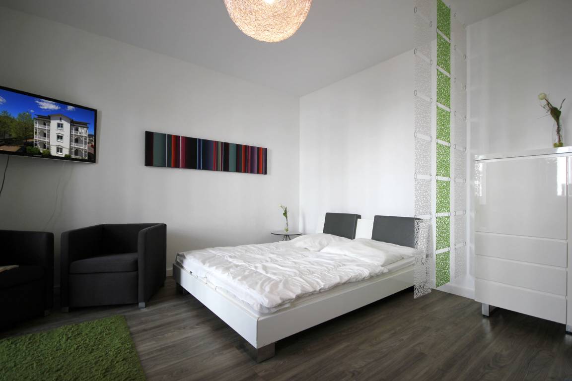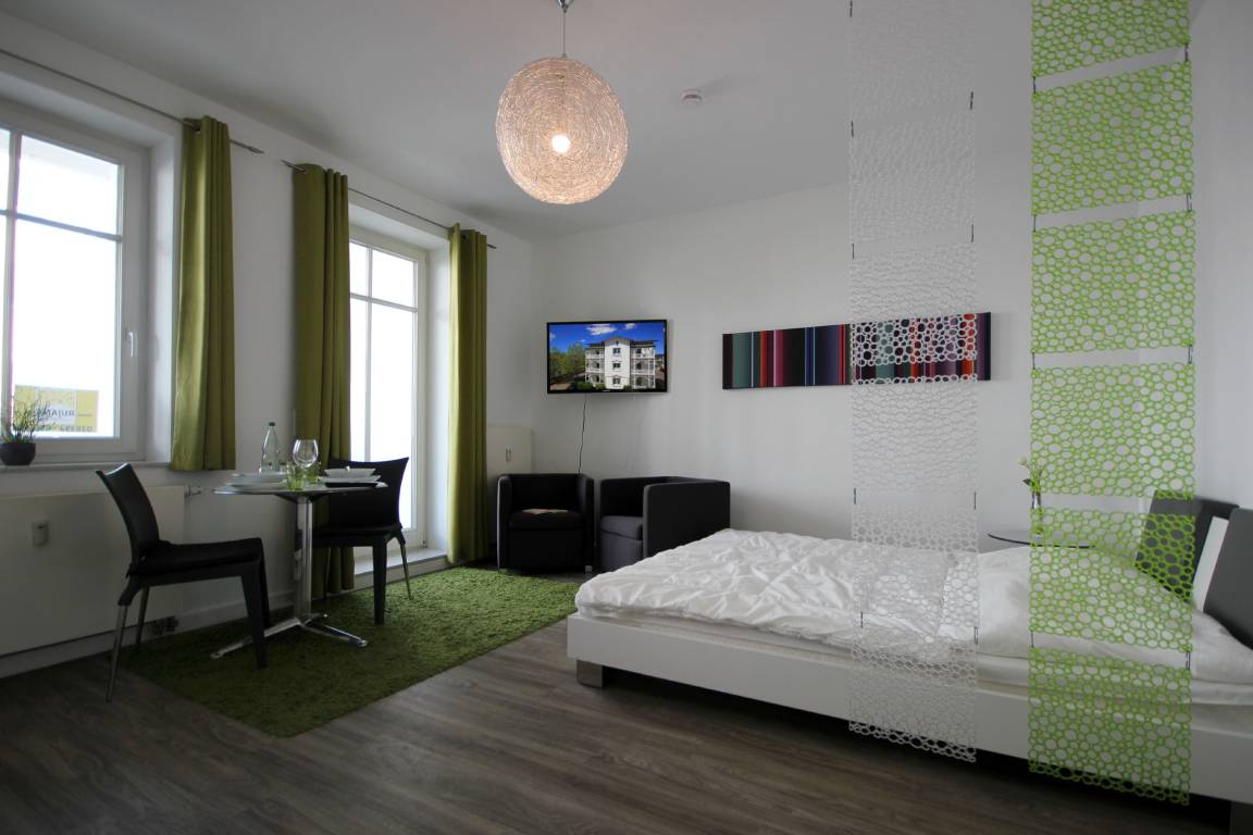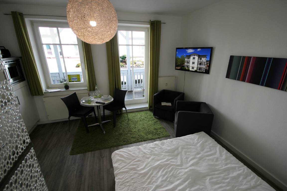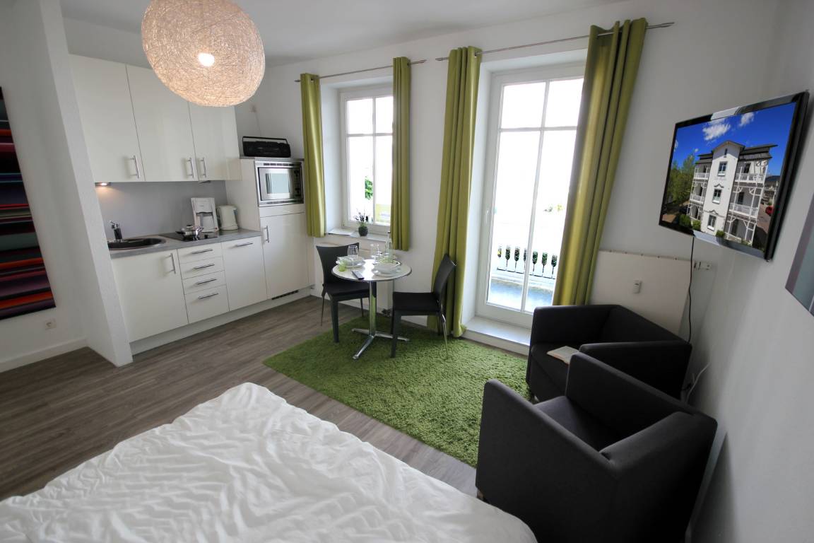 Ihre Ferienwohnung 1RB1 liegt im Erdgeschoss der Villa. Sie hat eine schöne überdachte Terrasse über die gesamte Wohnungsbreite. Die 36qm große und moderne 1-Raum-Wohnung bietet 2 Personen Platz für einen angenehmen Aufenthalt. Neben einem kombinierten Wohn-/Schlafraum mit integrierter Kochzeile verfügt das Appartement über einen geräumigen Flur und ein helles Badezimmer mit Waschtisch, Dusche und WC. Im Wohn-/Schlafraum finden Sie neben der Sitzmöglichkeit ein großes Doppeltbett sowie einen separaten Essplatz, Flachbild-TV und Radio. Die Küchenzeile ist unter anderem mit Cerankochfeld, Mikrowelle und Geschirrspüler ausgestattet. Alle unsere Gäste können einen kostenfreien W-LAN-Zugang nutzen.