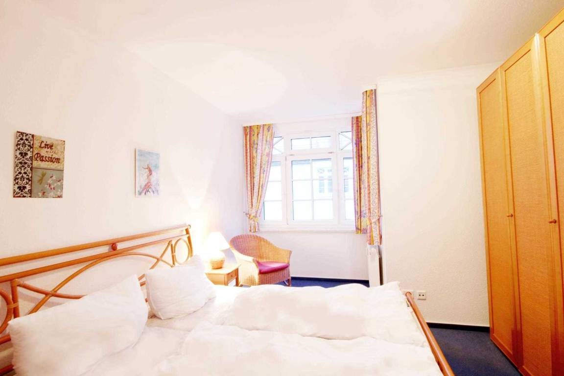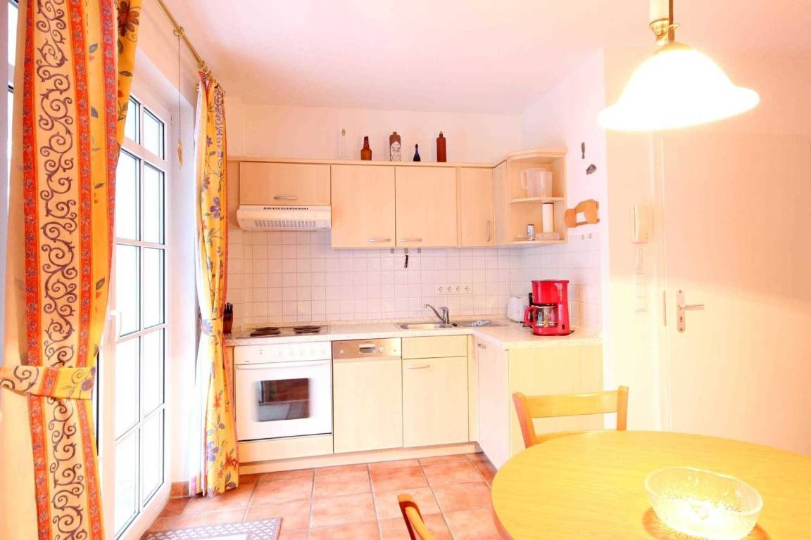 Ihre Ferienwohnung 9RB35 befindet sich in der ersten Etage der Villa Bernstein in der Residenz am Klünderberg. Die 2 Zimmer - Wohnung hat eine Größe von ca. 44 qm2 und ist mit maximal 4 Personen belegbar. Neben dem Wohnraum mit offener Küche gibt es einen separaten Schlafraum sowie ein helles Badezimmer mit Waschtisch, Dusche, WC und einem Handtuchheiztrockner. Der großzügige Schlafraum ist mit einem bequemen Doppelbett und einem großem Kleiderschrank ausgestattet. Im Wohnraum finden Sie ein Schlafsofa zur Aufbettung und einen Flachbild-TV. Die Küchenzeile mit Essbereich ist mit Geschirrspüler, Backofen, 4-Platten-Herd, Kühlschrank mit Gefrierfach, Kaffeemaschine, Toaster, Wasserkocher und diversen Kleingeräten ausgestattet.